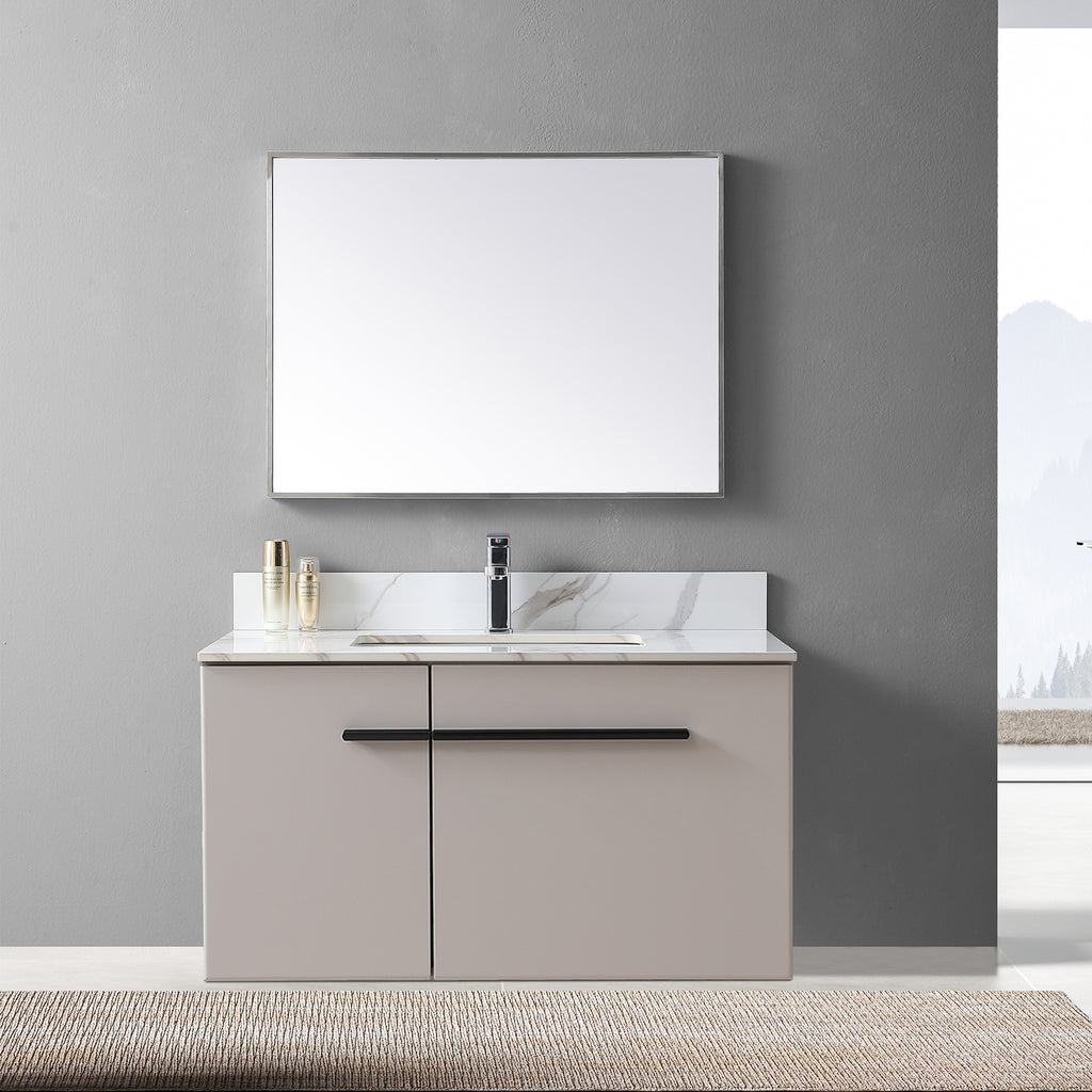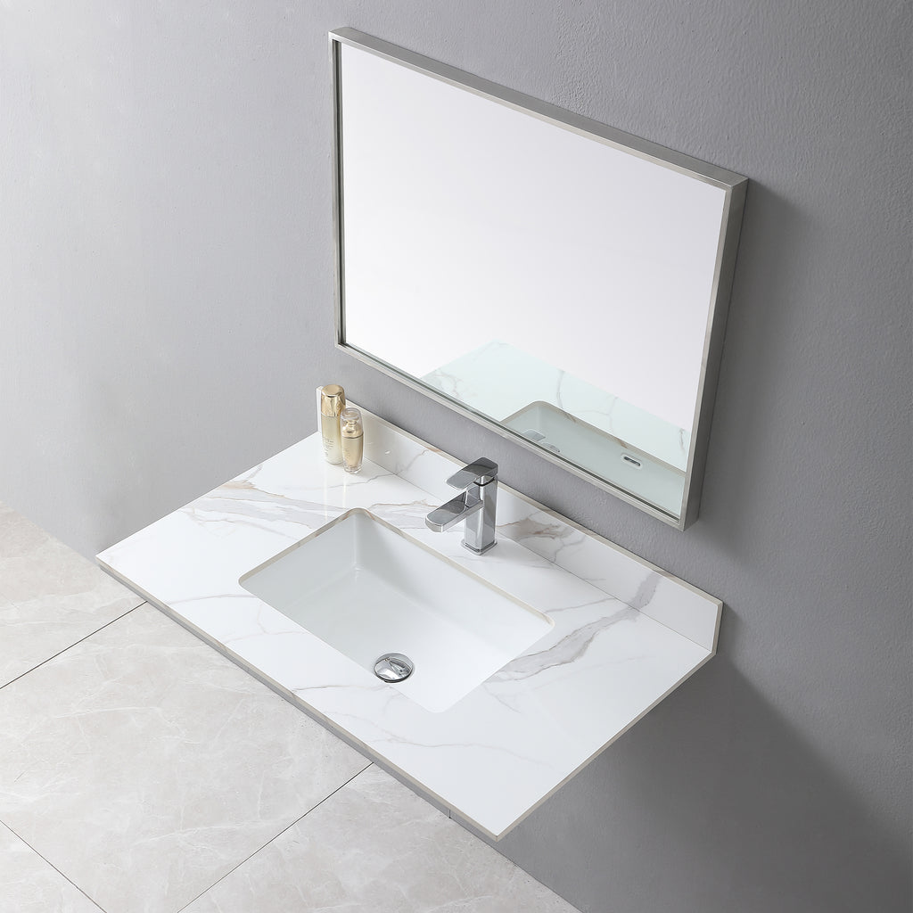 - The vanity tops are made of beautiful sintered stone. All exterior sides are polished for a luxurious look. Each model is complemented with a ceramic Rectangle undermount sink. The matching backsplash is included in each package.