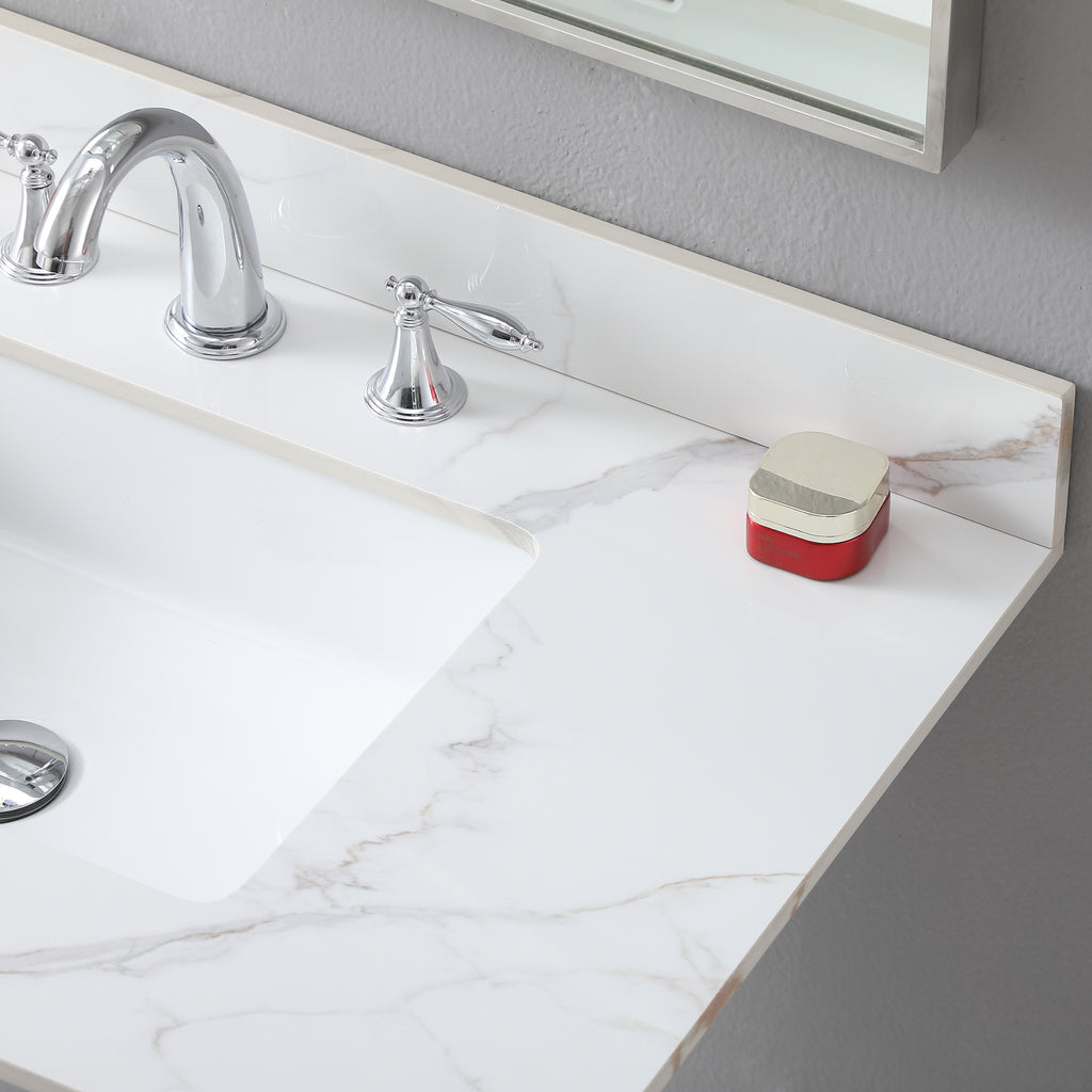 - The vanity tops are made of beautiful sintered stone. All exterior sides are polished for a luxurious look. Each model is complemented with a ceramic Rectangle undermount sink. The matching backsplash is included in each package.