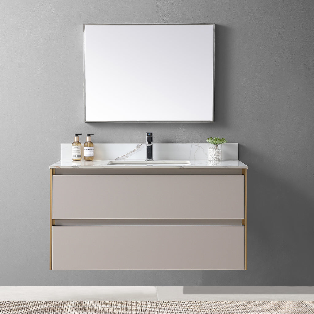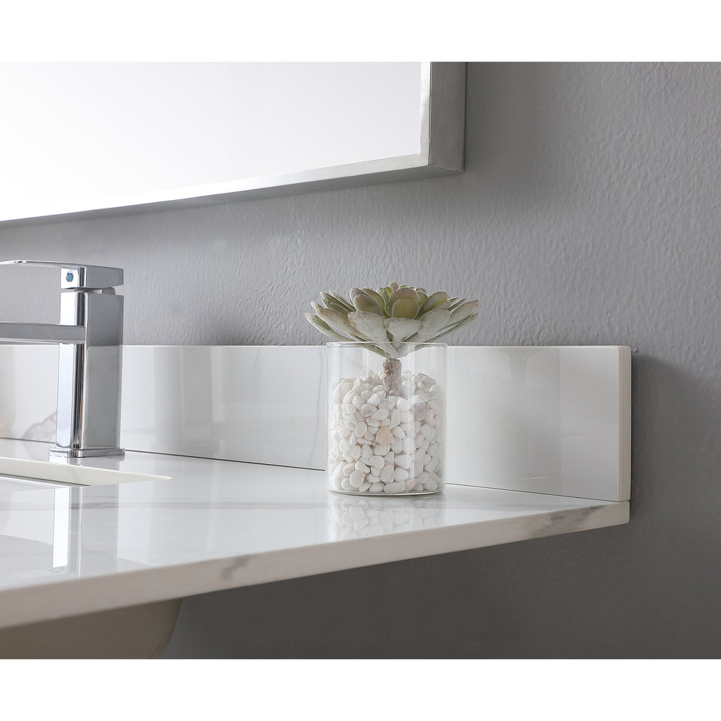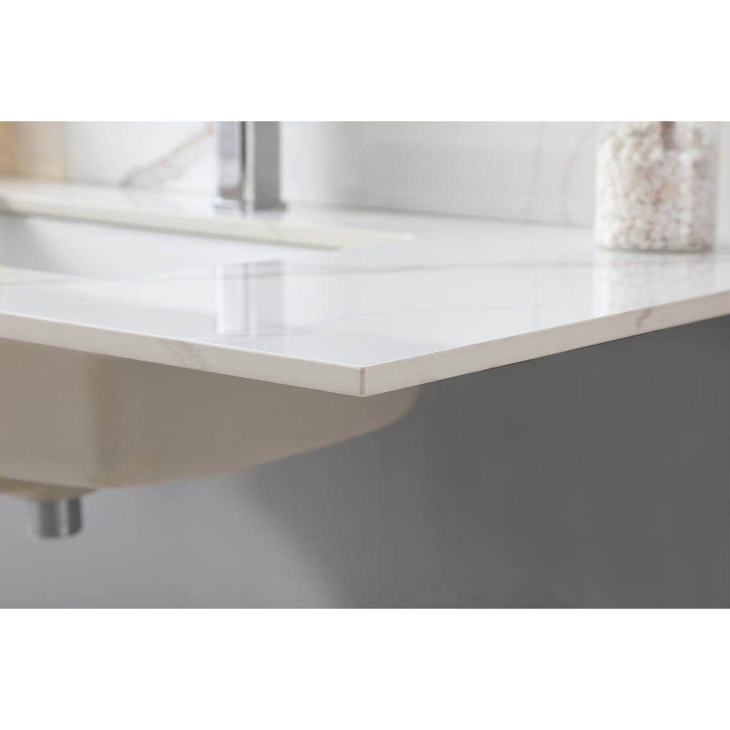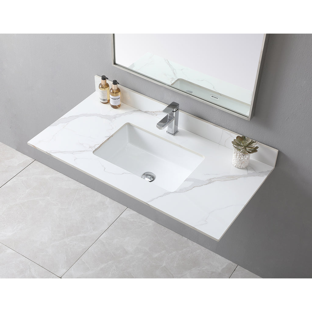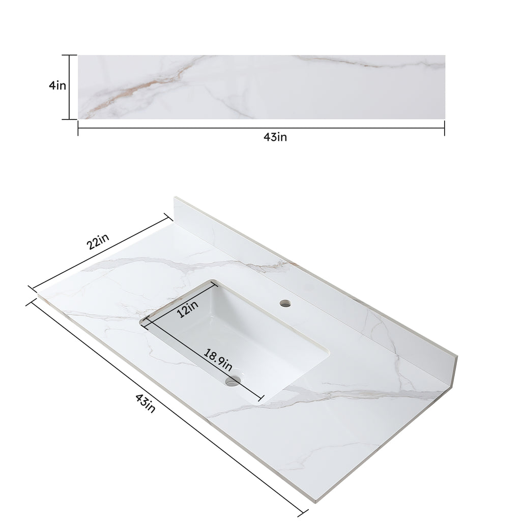 - The vanity tops are made of beautiful Sintered stone. All exterior sides are polished for a luxurious look. Each model is complemented with a ceramic Rectangle undermount sink. The matching backsplash is included in each package.