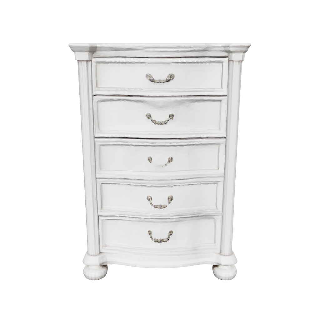 Transform your inner sanctum into a haven of timeless elegance and functionality. This traditionally styled chest of drawers is adorned in a classic antiqued white finish, highlighted by a serpentine-shaped front with thick decorative moulding. Its drawers are packed with ample storage possibilities. And did we mention the stylish reeded bun feet? Talk about relaxed refinement.