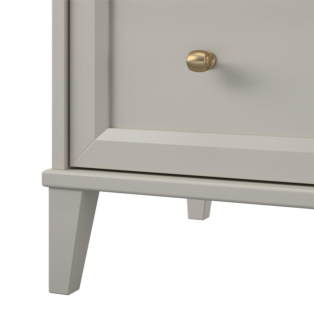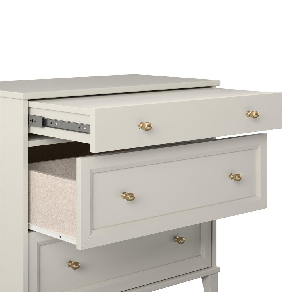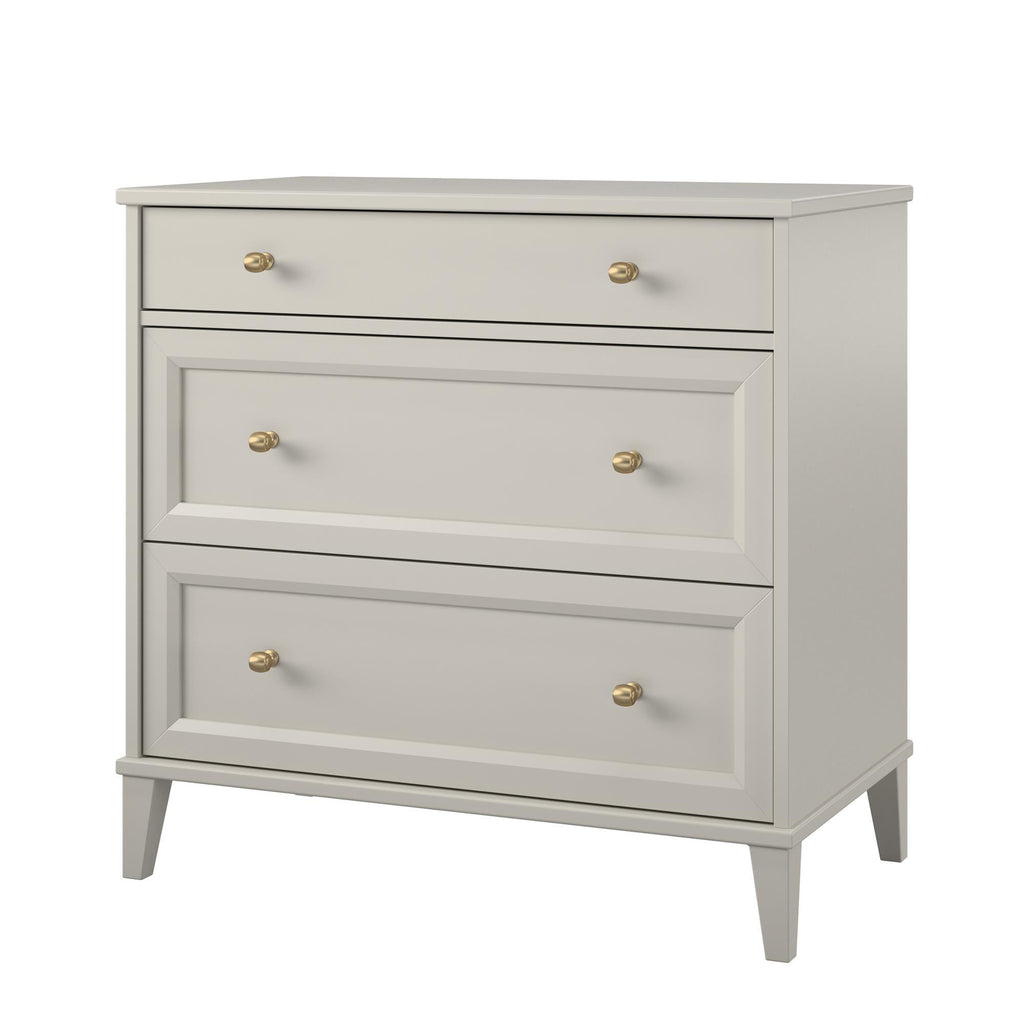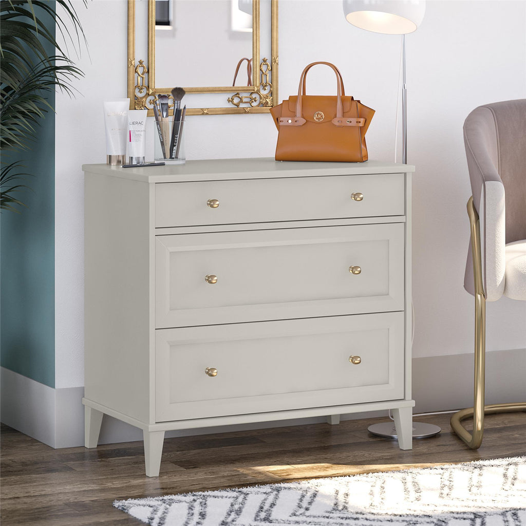 - Made from sturdy MDF and particle board, featuring solid wood legs, beveled drawer fronts, and brassy gold hardware.
