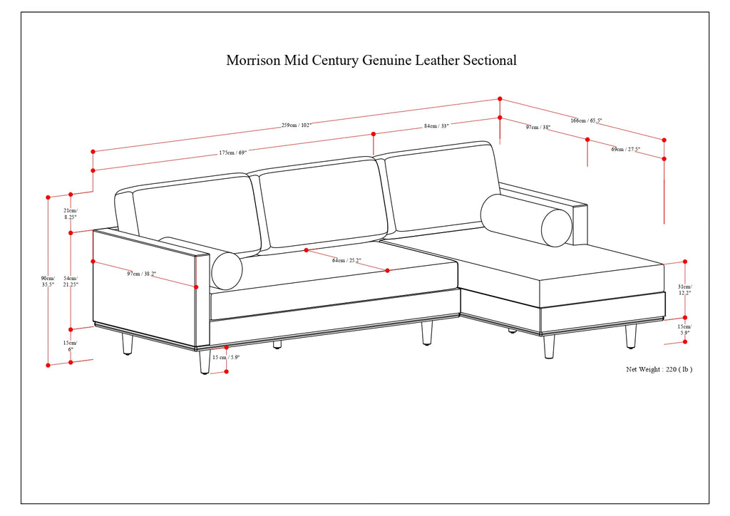 - Generously sized to offer comfortable seating for 4 people, this right-facing, mid-century modern sectional sofa measures 102-inches wide and accommodates up to 1,200 lbs.