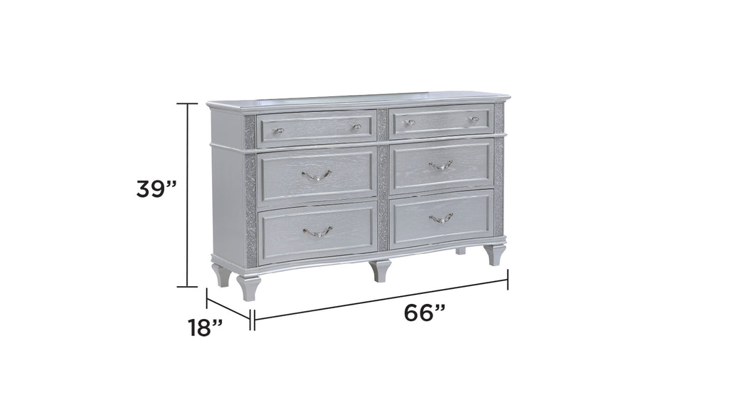 • Dresser, nightstand, and chest have velvet-lined top drawers for delicate items.