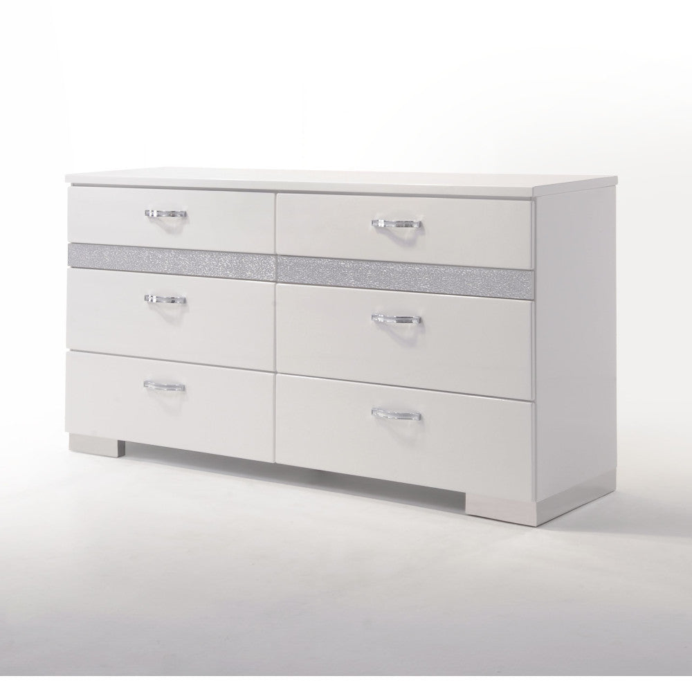 - Glittery accents on the drawer fronts add a touch of glamour, while sleek metal handles offer both style and ease of use, making this dresser a functional yet chic addition to any room.