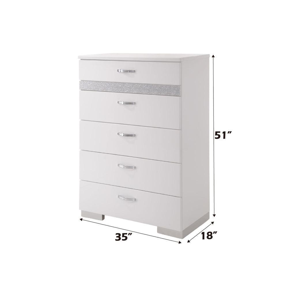 - Glittery accents on the drawer fronts bring a touch of elegance and visual interest, while modern metal handles provide a comfortable grip and elevate the chest's chic look.