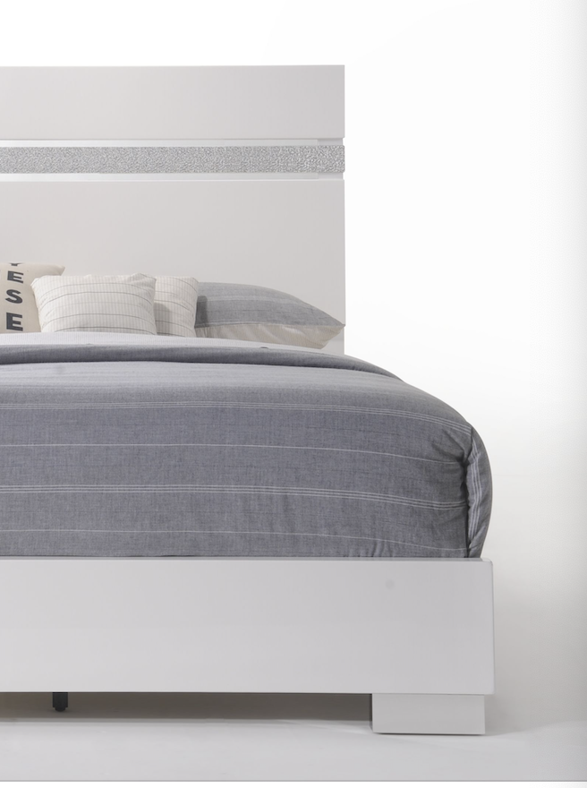 - The high gloss finish enhances its sleek appearance, while the sparkling acrylic panel adds a touch of luxury and sophistication to the headboard, creating a glamorous focal point.