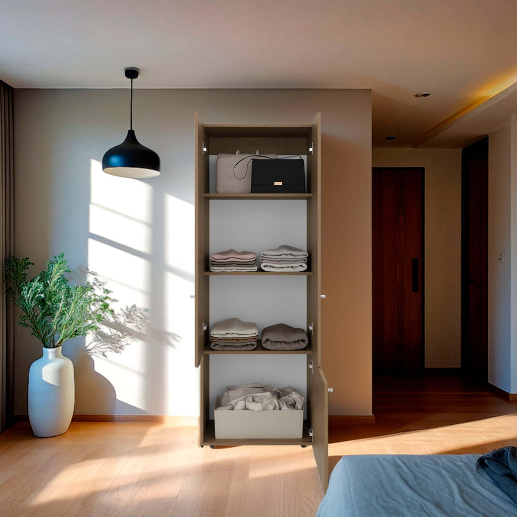 The Natural Wardrobe Cabinet features a warm wood finish that enhances bedroom aesthetics with timeless and versatile appeal. Its rectangular shape with a three-door design and four shelves maximizes vertical storage space, providing organized compartments for books, décor, and daily essentials while fitting seamlessly into various room layouts and design schemes.