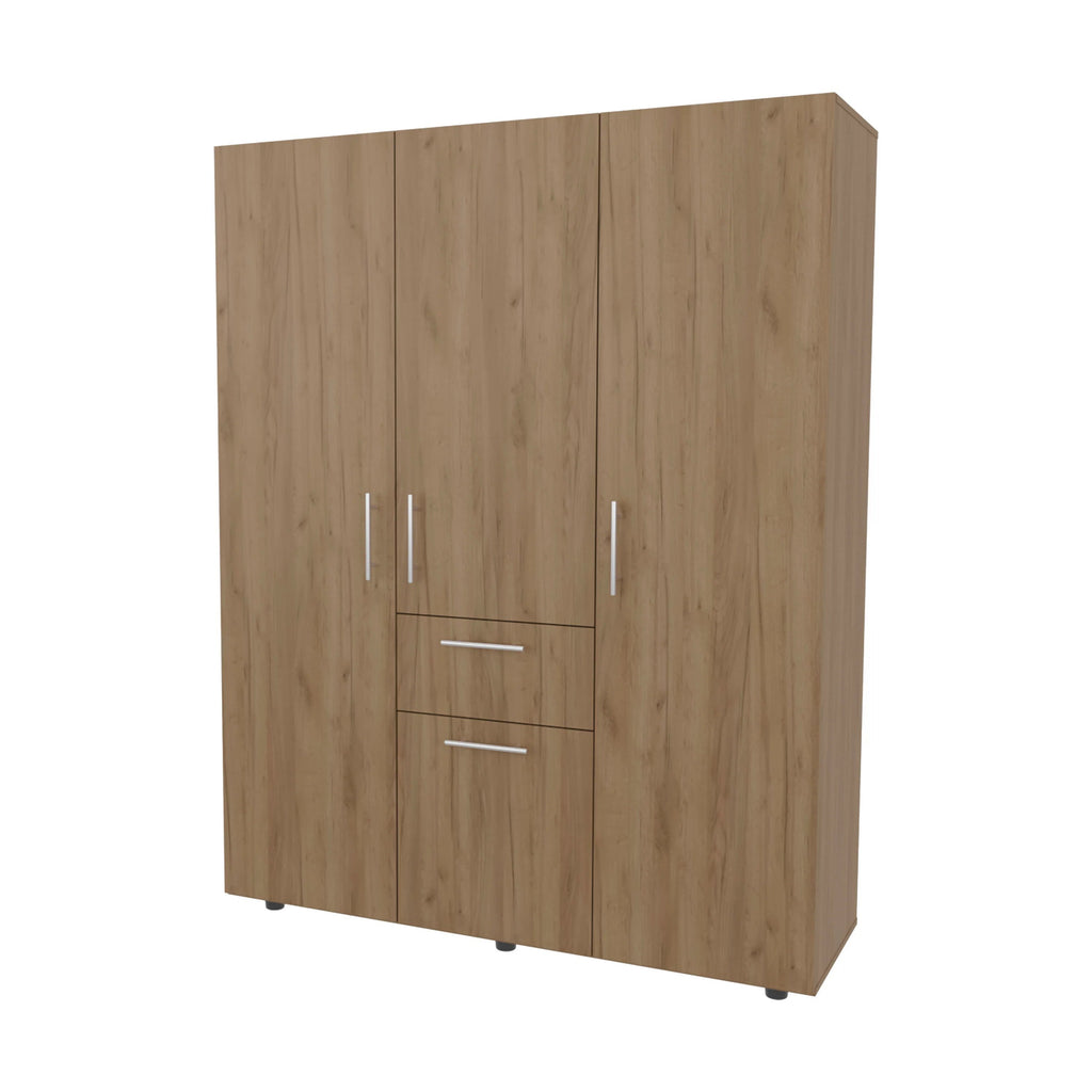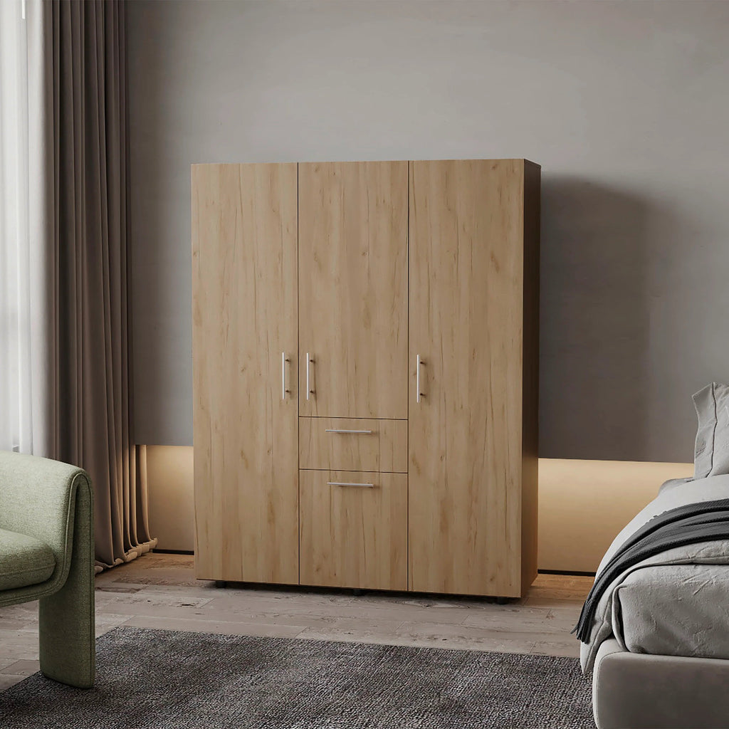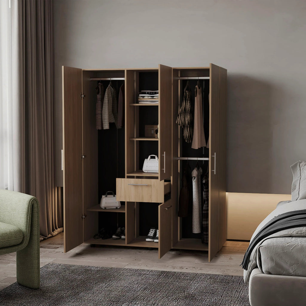 Designed to maximize storage and keep your clothes neatly organized, this 4-door armoire features dedicated hanging sections, multiple open shelves, a spacious drawer, and bottom compartments. Crafted with a modern wood finish, durable construction, and elegant metal accents, it's the perfect addition to any bedroom for both functionality and style.