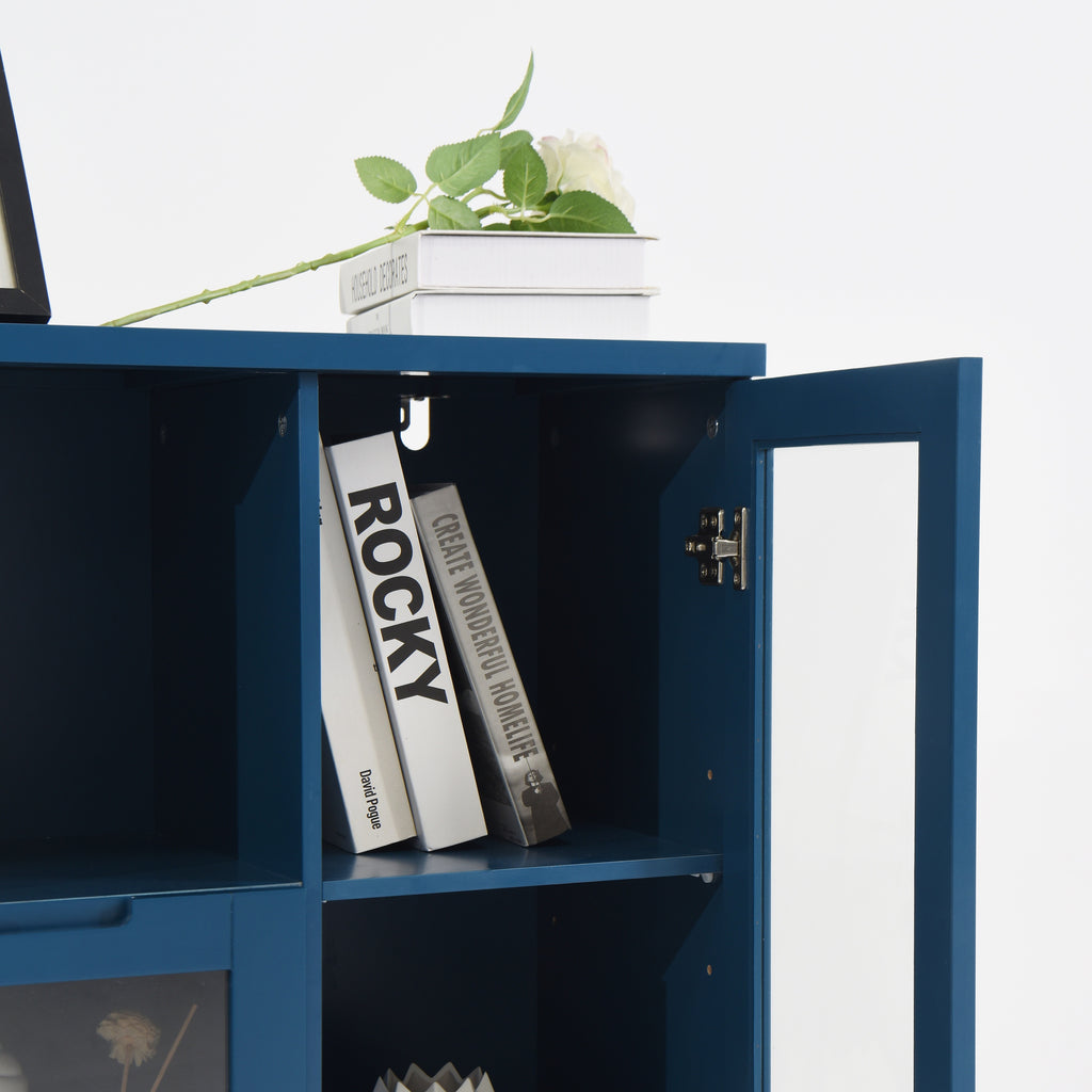 - Blue Color Design: Modern style and decorative 2 doors with glass inside make it fascinating in any room space. Handleless design feelings of exquisite. Combining elegance, modern feeling. Unique appearance and classic style make it matched in kinds of living space styles. This storage cabinet being practical to meet various storage needs.