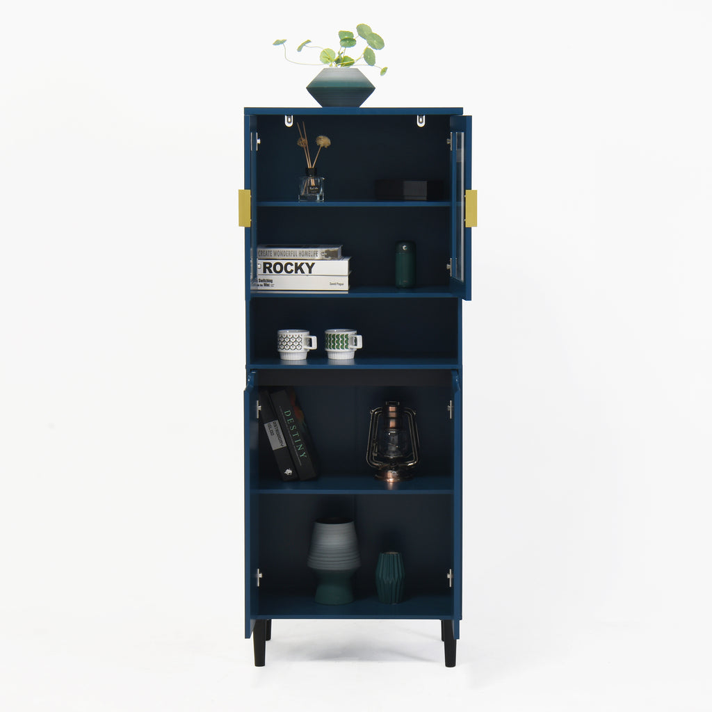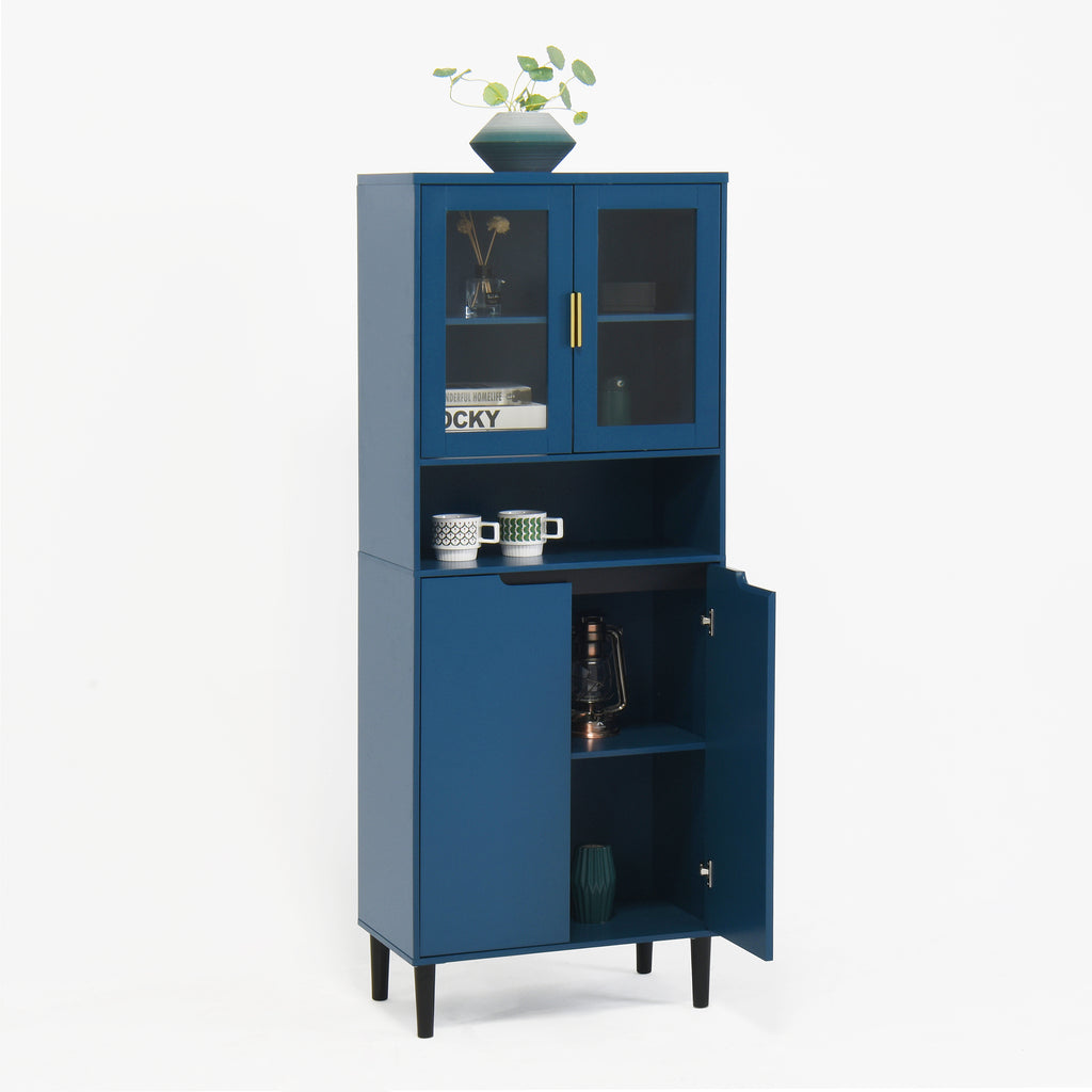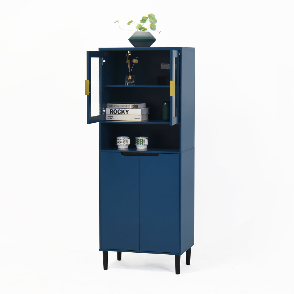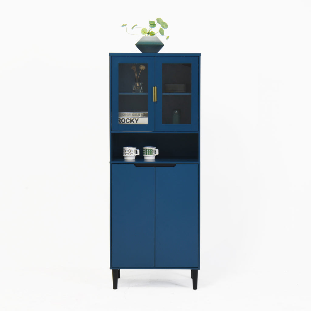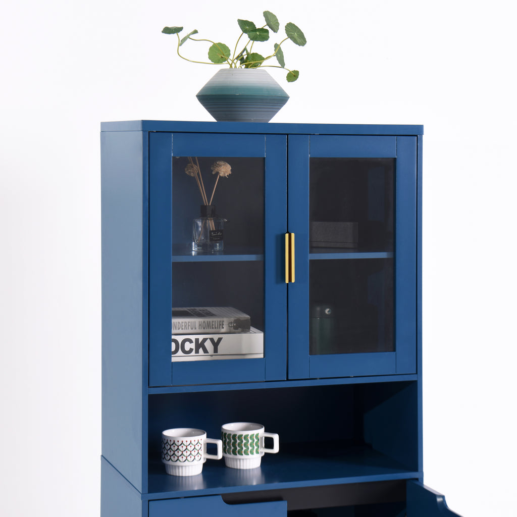 - With its elegant yet chic appearance and classified practical design, this blue cabinet is suitable for various places: living room, kitchen pantry, bathroom, office, entryway, or any corner, even as buffet cabinet at dining room. Moreover, the top storage cabinet is equipped with two glass doors, allowing it to be used as a filing cabinet, display cabinet, or bookcase in a home office.