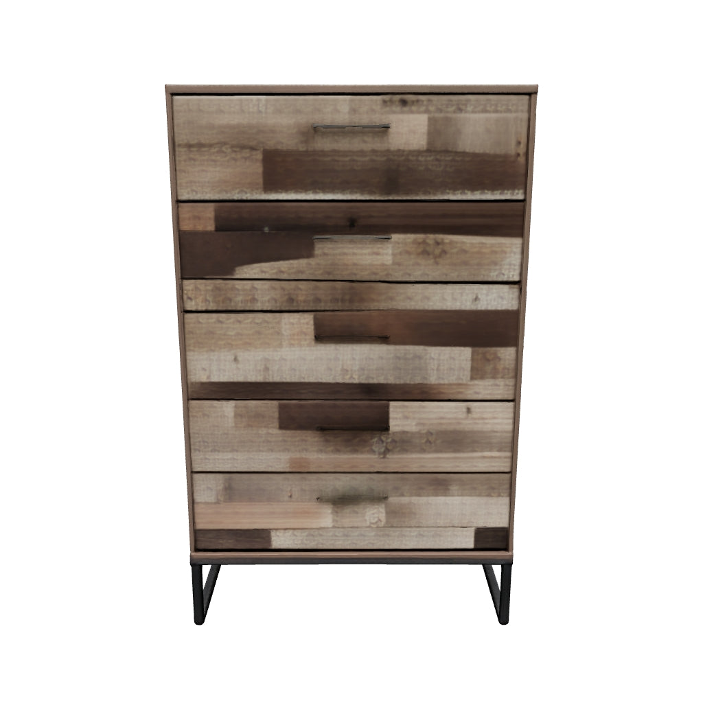 Streamlined design and a stunning finish come together in one simply extraordinary piece. This chest of drawers is sure to impress with five smooth-operating drawers, canted metal legs and a rustic butcher block finish over replicated pine grain texture. Its mid-century style is a nod to the past, while the updated finish keeps it solidly in the present.