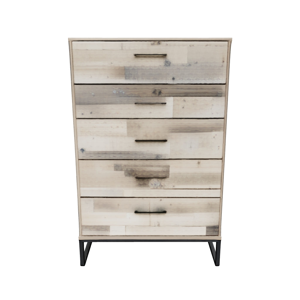 Part beach chic, part urban hip, this chest of drawers is everything you dreamed of, at a comfortably cool price. The butcher block whitewash finish over replicated pine grain lends a richly relaxed aesthetic that suits your sensibility. Dark pewter-tone drawer pulls and sled legs add a high design element. What an easy-breezy choice for a naturally beautiful bedroom retreat.