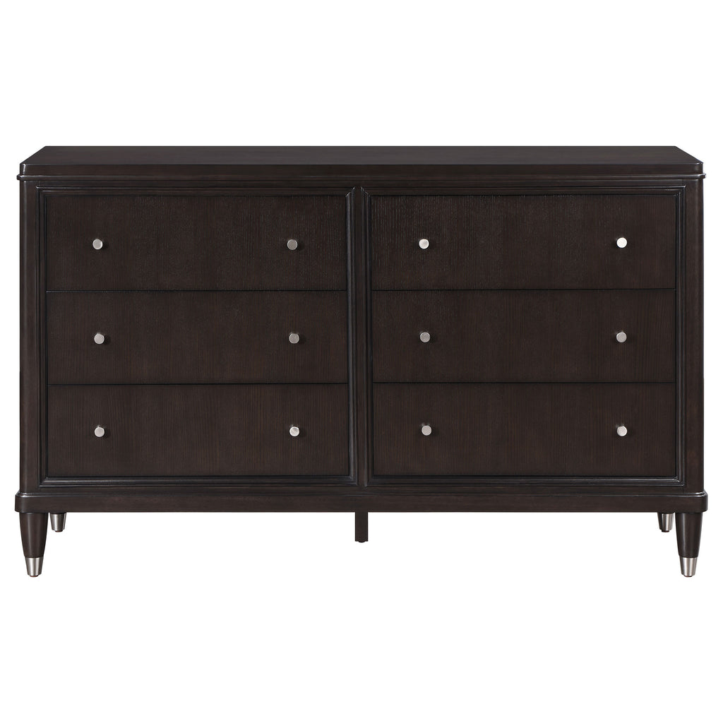 A dark brown finish is elevated with the silver-toned hardware, including petite knobs and ferrules, on this contemporary six-drawer dresser. Perfect for storing clothing, linens, and more, it offers impeccable styling with understated trim details and a wide top that's ready for a touch of personalization with decor or photos.