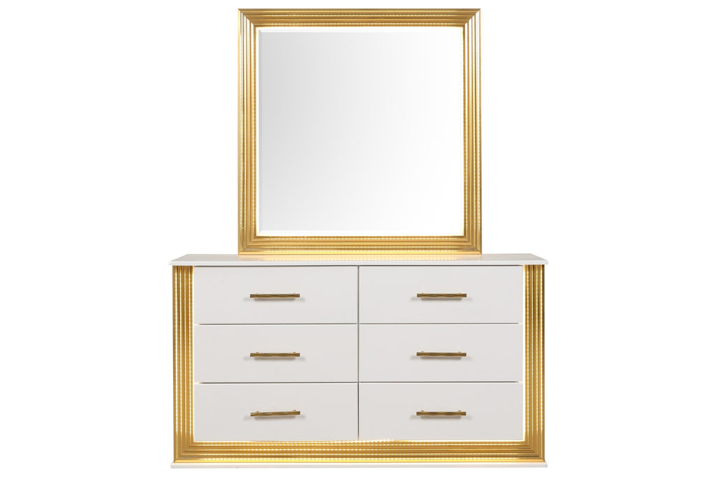 This contemporary dresser brings glamour and practicality to your bedroom decor. With six spacious drawers and LED lights, it offers ample storage and a touch of elegance. Crafted from solid and manufactured wood in a striking gold finish.