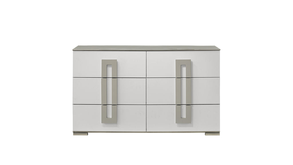Transform your bedroom into a contemporary oasis with this sleek White bedroom set, featuring a bed, dresser, mirror, chest, and nightstand. The LED-lit headboard adds a touch of modern sophistication, while the clean lines and minimalist design make this set a perfect fit for any modern home. The soft gray tones create a calming atmosphere, ensuring a restful night's sleep. Each piece is crafted for both style and functionality, offering ample storage space with a polished, high-end finish.