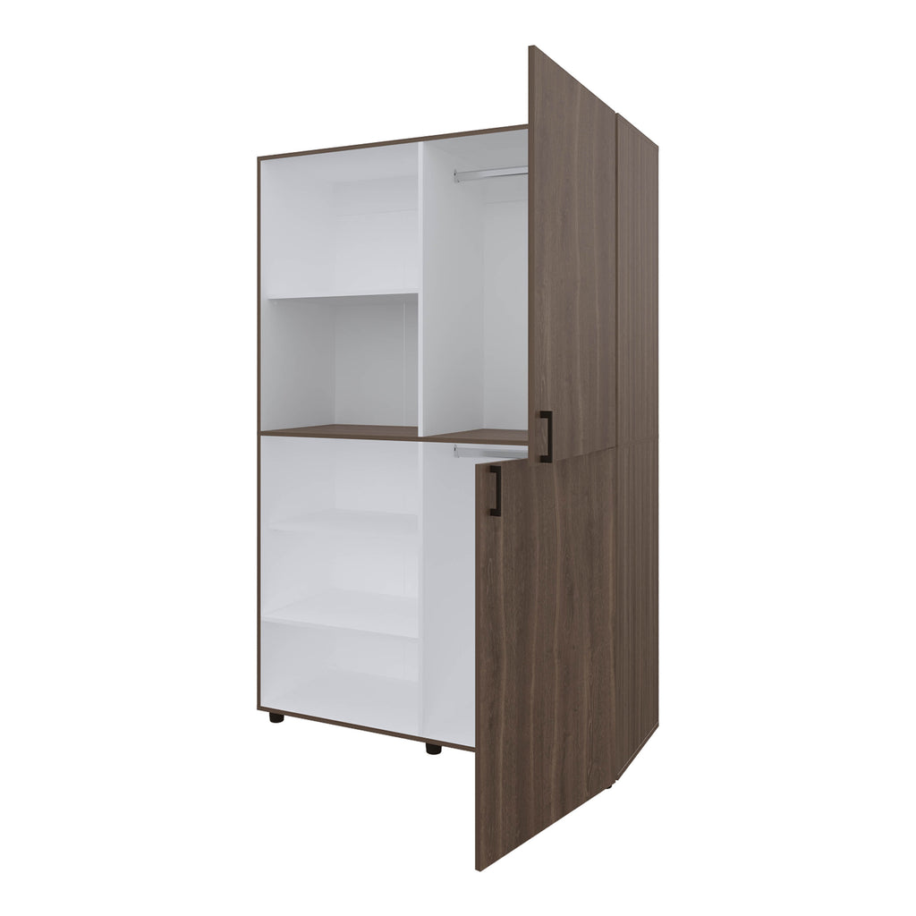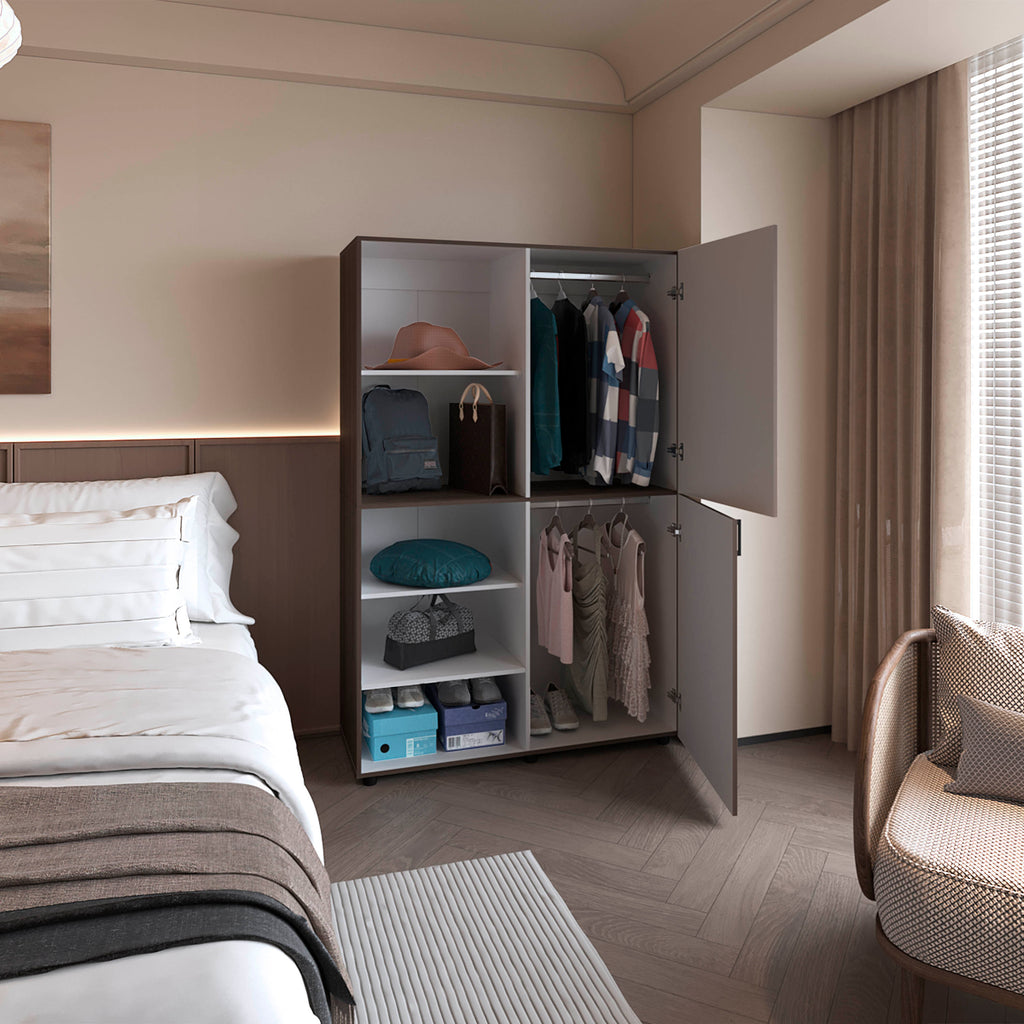 - Spacious hanging rod and multiple shelves to store clothes, accessories, and essentials.