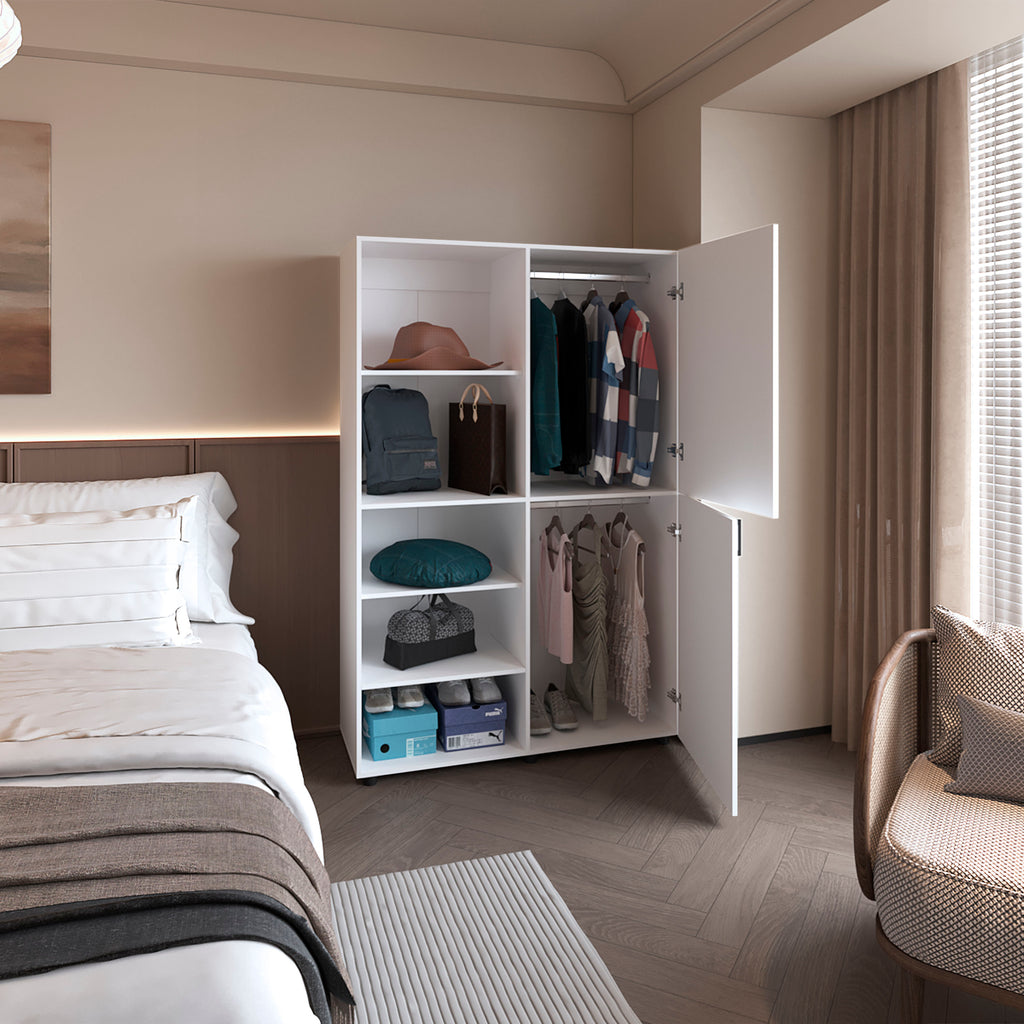- Spacious hanging rod and multiple shelves to store clothes, accessories, and essentials.