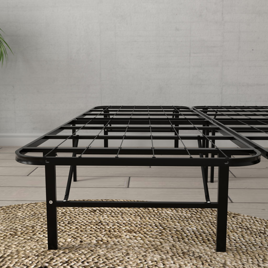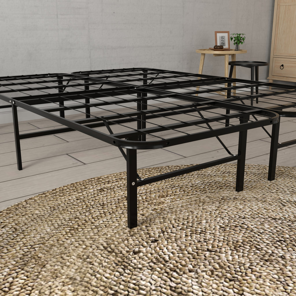 Upgrade to the Omne Sleep Twin Steel Platform Foundation, a heavy-duty, no-box-spring solution that supports up to 2,000 lbs. Enjoy effortless, tool-free assembly in minutes and a 14-inch elevated height for valuable underbed storage. This sturdy foundation offers superior mattress support and minimizes motion transfer for a peaceful night's sleep.
