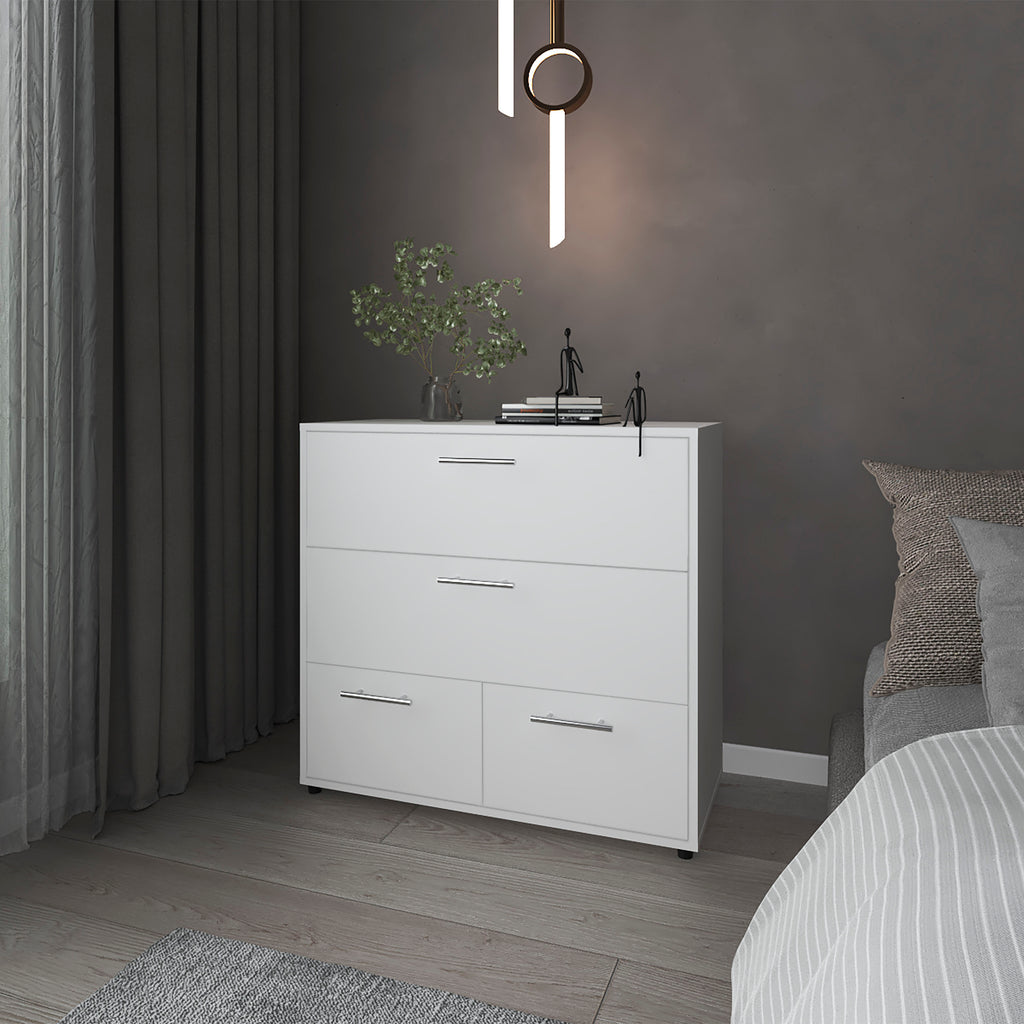 '''Modern dresser of drawers featuring a practical design with two spacious large drawers and two smaller divided drawers, perfect for organizing clothing, linens, or accessories. Its sleek and minimalist aesthetic makes it a versatile addition to bedrooms, living rooms, or a baby’s nursery. The durable construction and smooth metal handles ensure long-lasting use and ease of access. Whether storing everyday essentials or special items, this chest offers a stylish and functional storage solution for any space.''