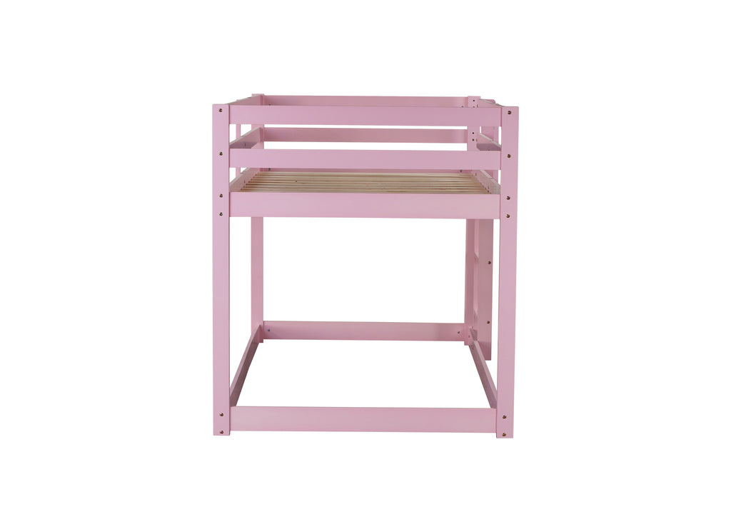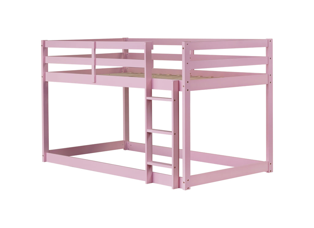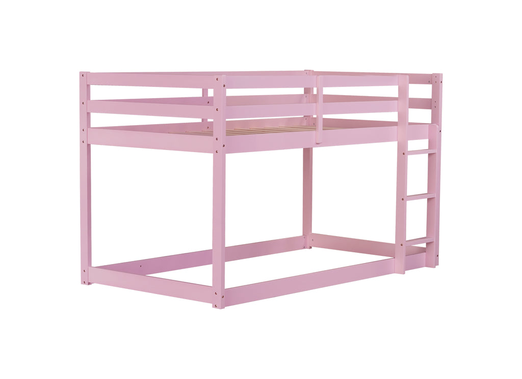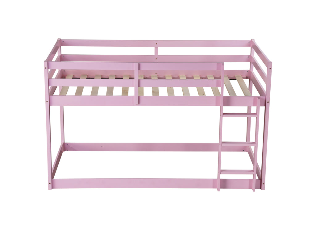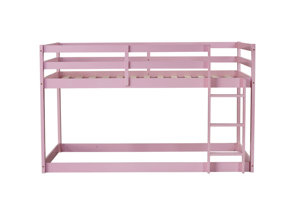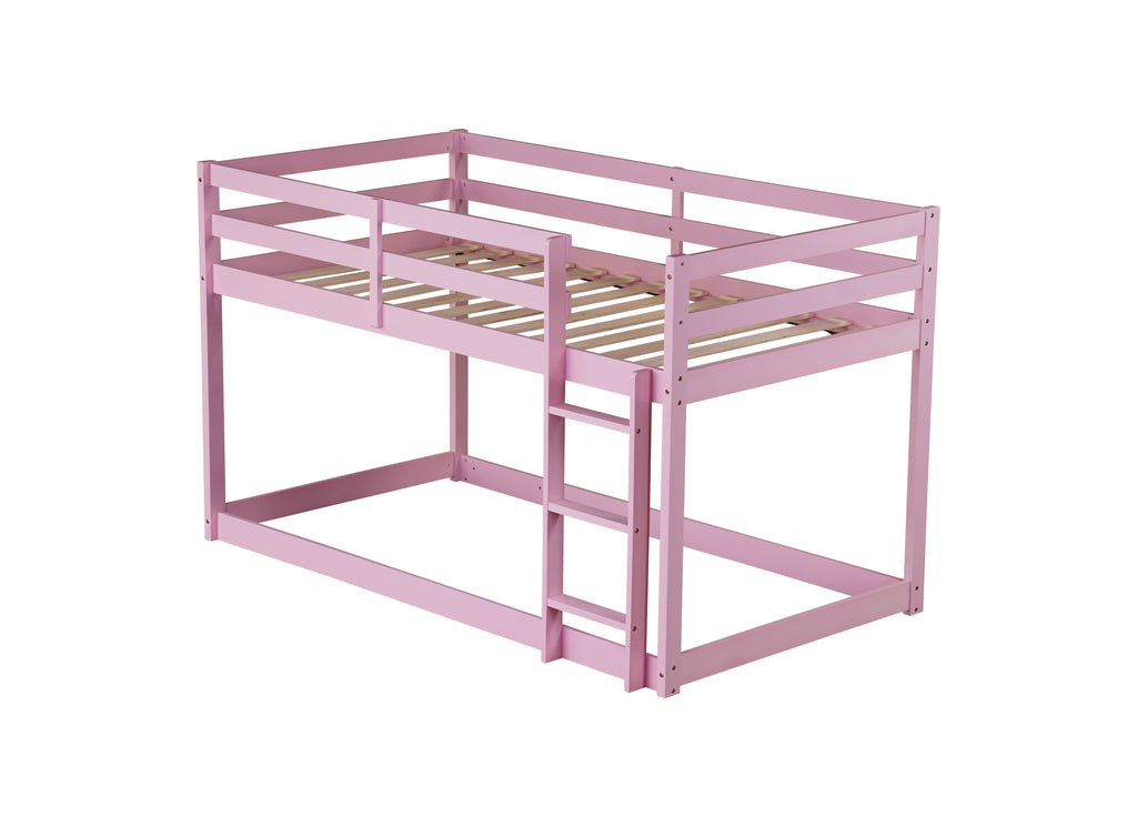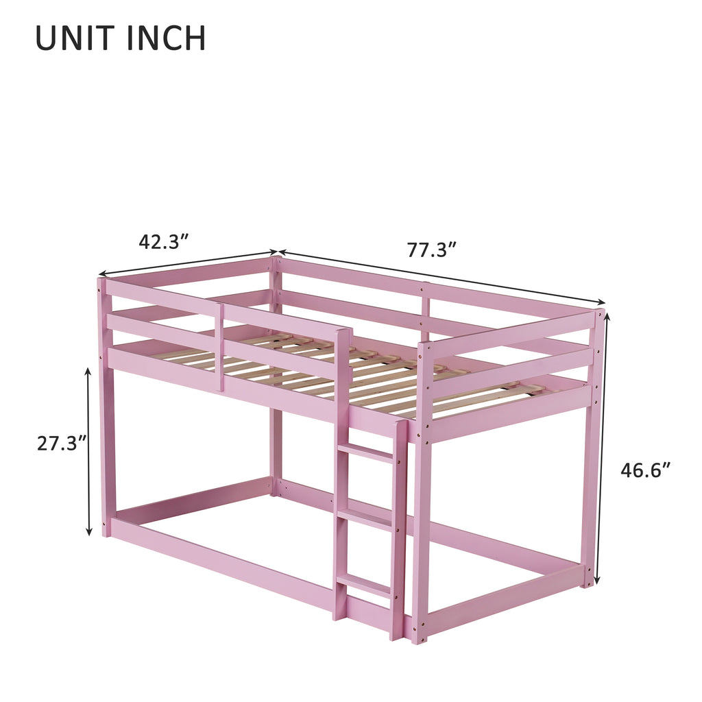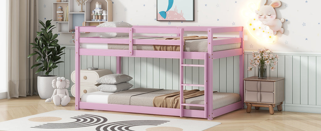 - #1 [Twin over twin bed Design]The low height feature of this twin over twin floor bunk bed not only ensures better stability but also increases versatile utilization. The unique design offers diverse sleeping preference as well as optimizing storage space. The ladder is crafted with a wider width to provide more spacious steps and solid support, ensures a more convenient climbing up and down.