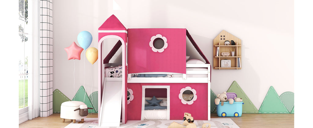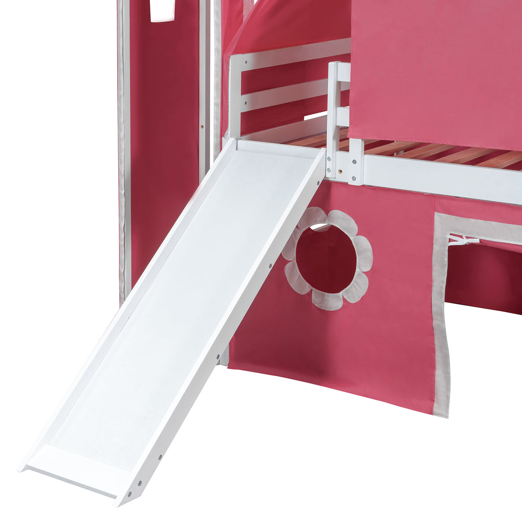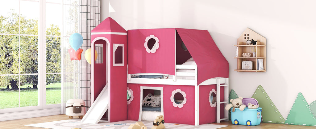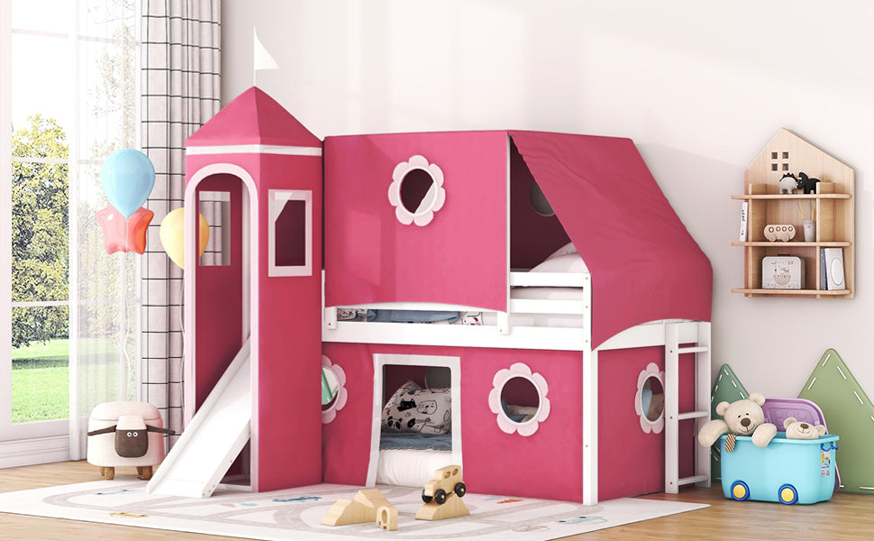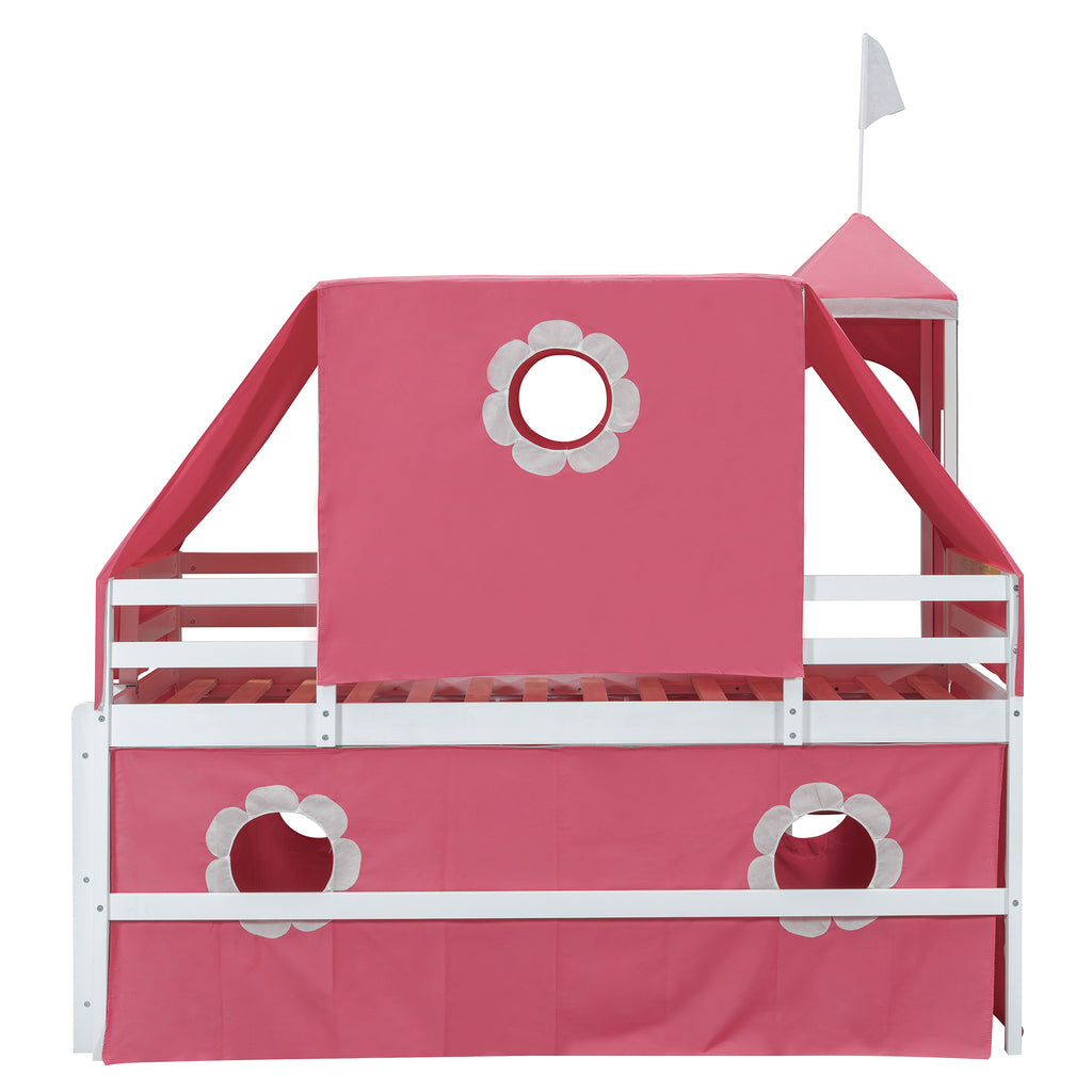 Transform bedtime into an enchanting adventure with this twin-size pink castle loft bed, crafted from solid wood and MDF for lasting durability. Its unique playhouse design features a fun window, three tower installation options, and spacious under-bed storage, creating a magical space for sleep and play. This sturdy, eye-catching bed is the perfect addition to spark imagination and bring joy to any child's room.