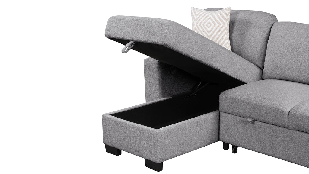 Sink into luxury with this multi-functional sectional, designed to elevate your living space with a perfect blend of comfort and convenience. Upholstered in a soft, durable fabric, this sectional offers a reversible design for flexible room arrangements and features sleeper sofa functionality to effortlessly transition into a cozy bed for guests. The integrated chaise includes spacious storage, allowing you to store away blankets, pillows, and more. Both armrests are equipped with bookshelf-style shelves, providing a practical space for books, decor, or essentials.