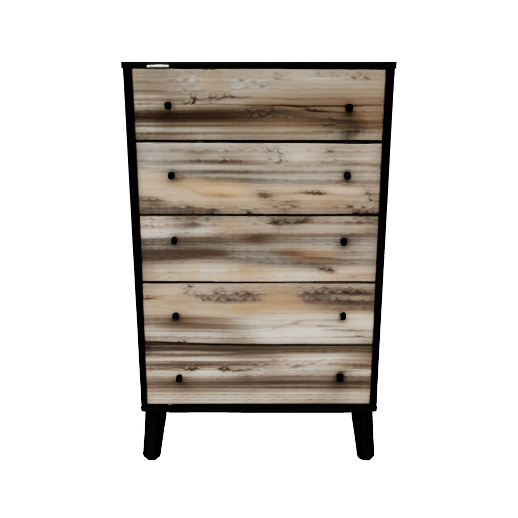 The perfect marriage of simple and contemporary style, this chest of drawers is a charming addition to your home. It sports an expressive two-tone look, with a dark finish over replicated oak grain with an authentic touch and a replicated sugarberry wood grain. Ball bearing glides offer smooth opening and closing of the drawers, while matte black knobs and splay legs add a finishing touch.