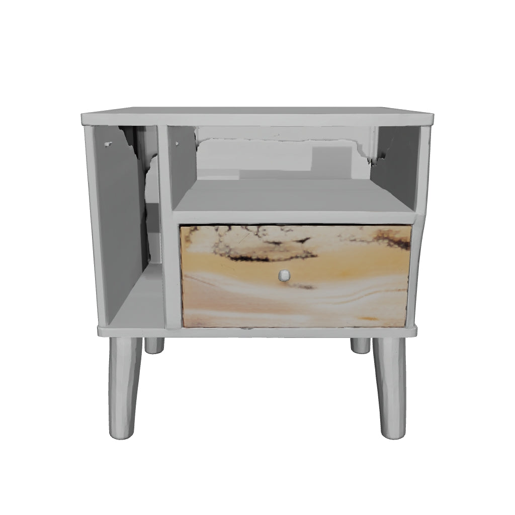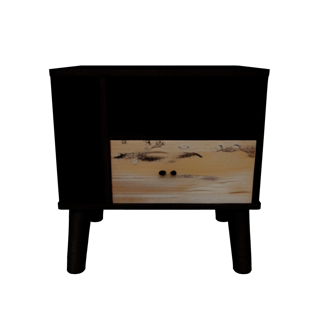 The perfect marriage of contemporary and casual style, this nightstand is a charming addition to your home. It's expressive with a two-tone look in a solid matte finish and a replicated sugarberry wood grain pattern. White knobs and splay legs add a finishing touch, while the open shelving allows for extra storage.
