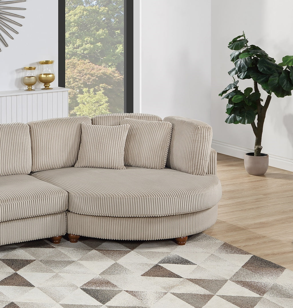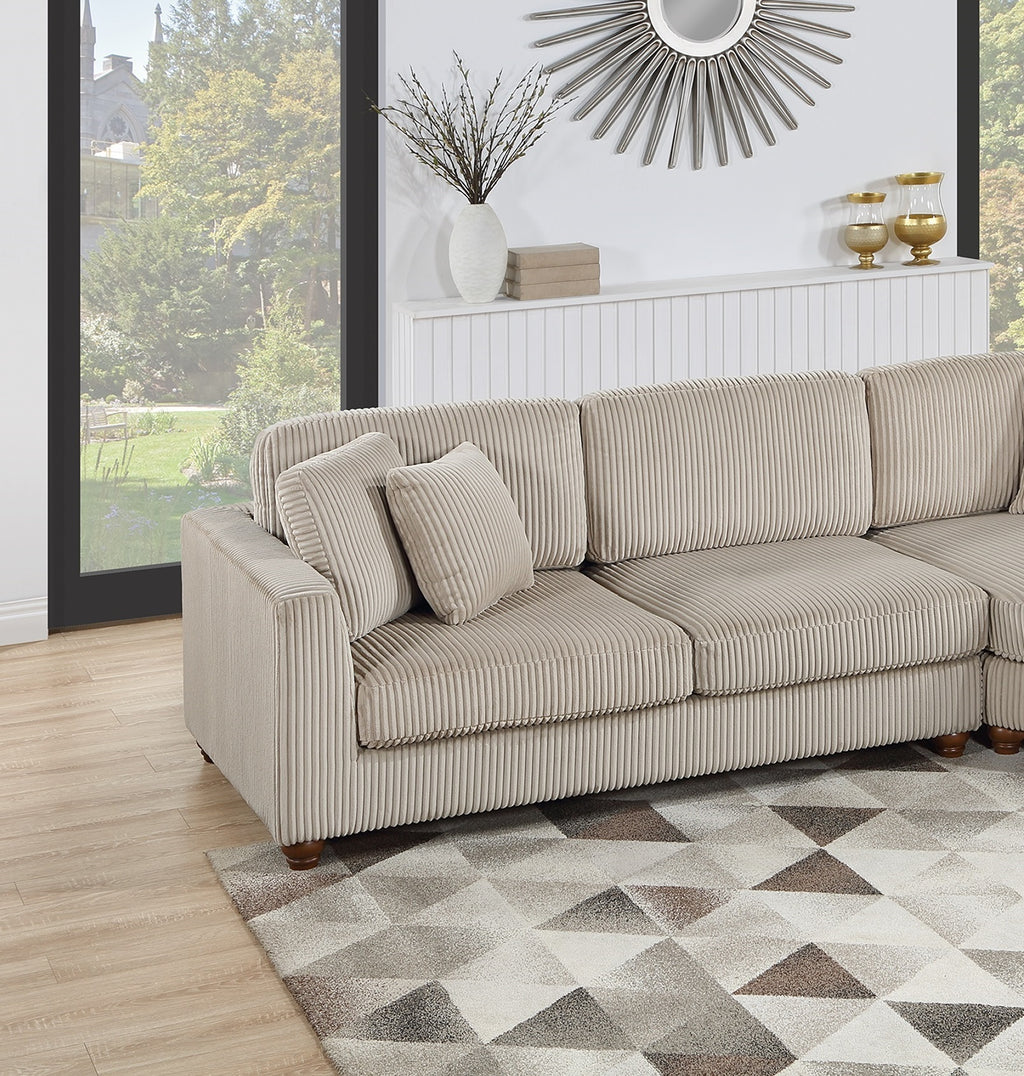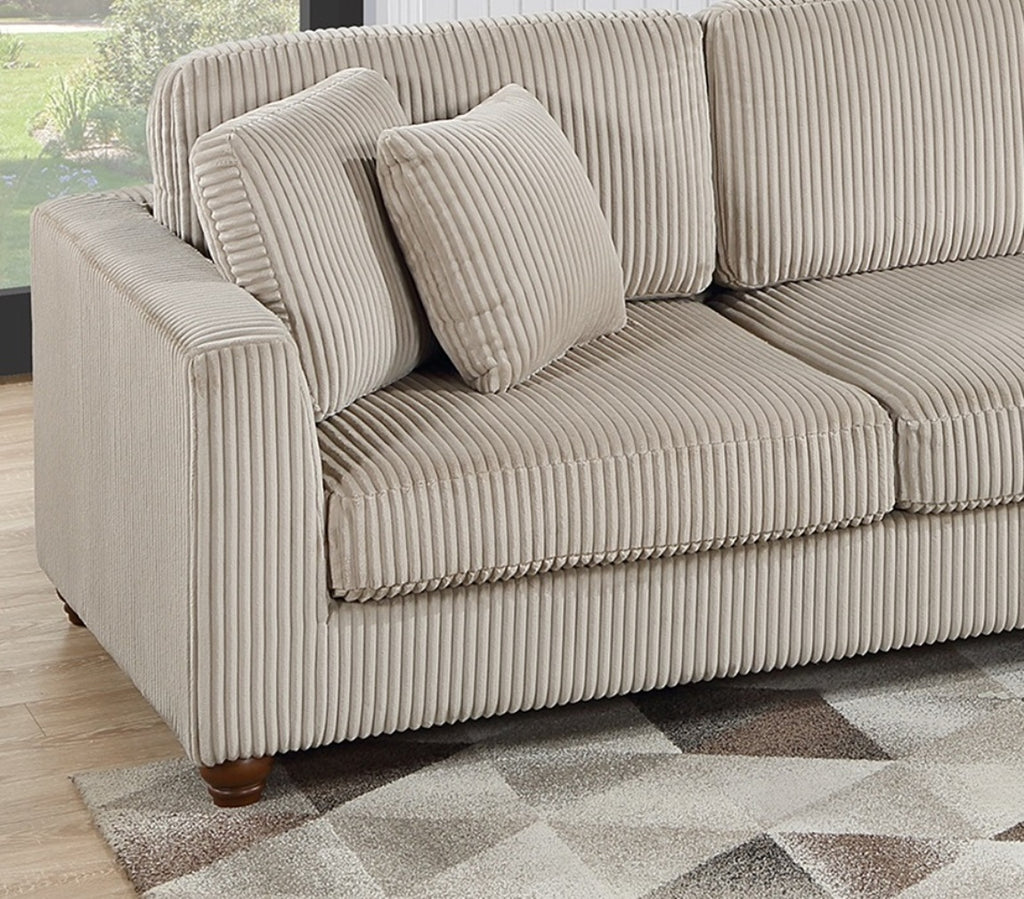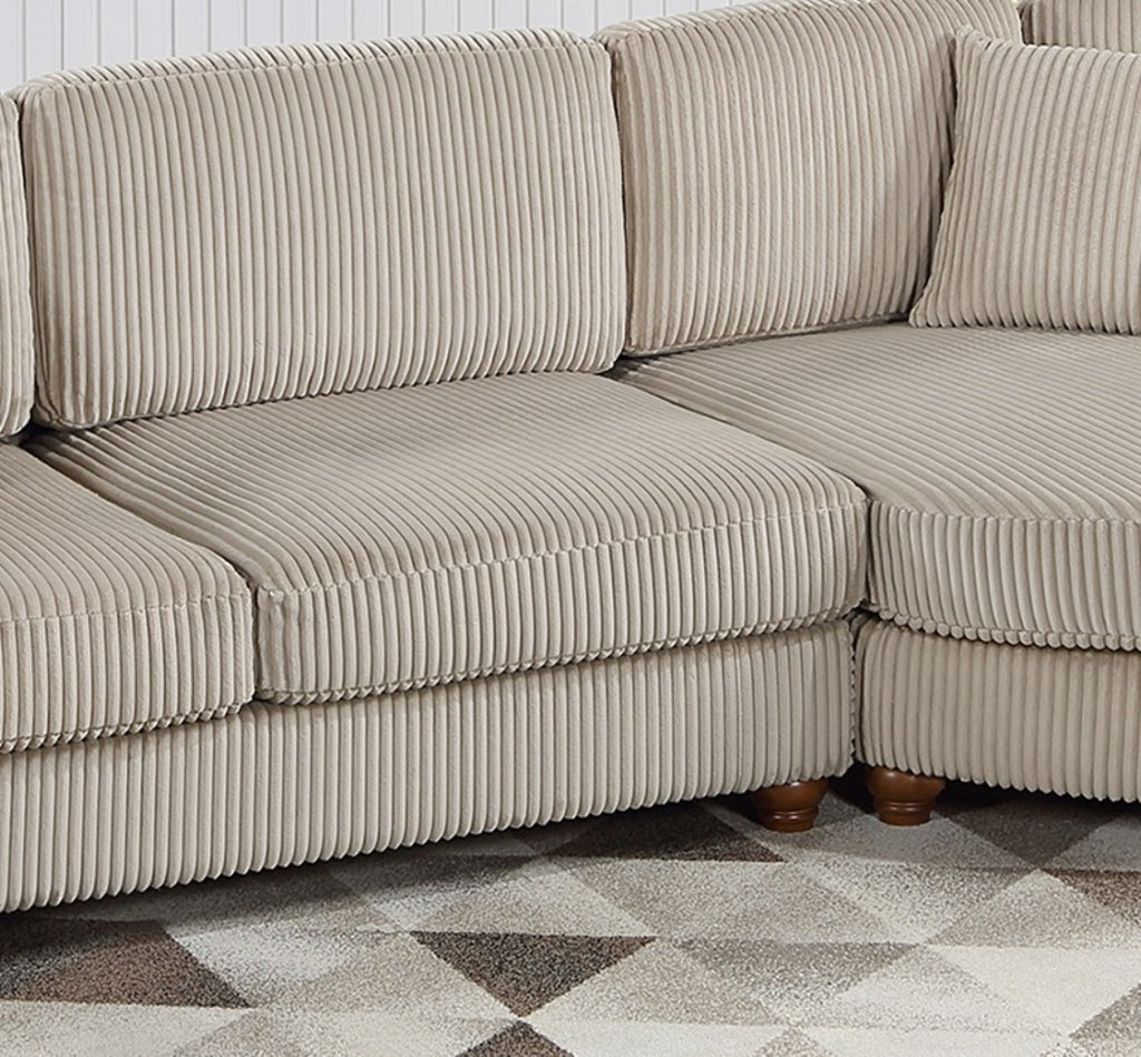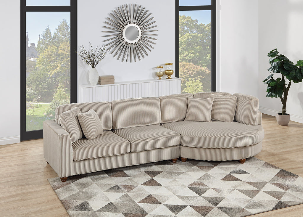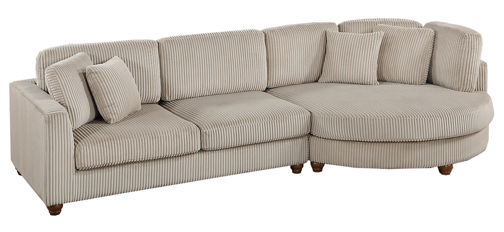 Transform your home into a sanctuary of comfort and style with this 2-Piece Sectional Set. Featuring a Right Arm Facing (RAF) Chaise and a Left Arm Facing (LAF) Sofa, perfectly complemented by four plush accent pillows. The RAF Chaise's unique round shape adds a modern twist to your décor, while the LAF Sofa provides versatile seating for all your gatherings. Supported by low-profile round legs, this sectional set exudes sophistication while ensuring comfortability. Sink into the sumptuous corduroy material, offering a soft touch that invites relaxation after a long day. Whether you're curling up with a good book or hosting guests for movie night, this sectional provides the perfect finishing touch to your living space.