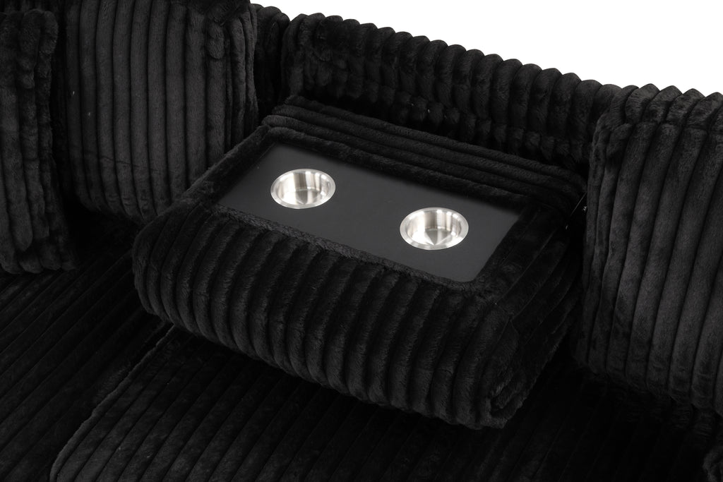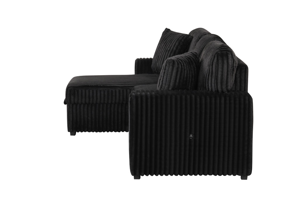 This stylish and versatile sectional is the ultimate solution for creating a cozy and functional living space. Crafted with soft corduroy fabric, it offers a plush, textured feel that enhances comfort and adds a touch of sophistication to any room. Available in elegant cream, sleek black, or refined gray, this sectional seamlessly blends with modern or contemporary décor. Designed to provide an all-in-one lounging experience, it features a convenient dropdown tray with built-in cup holders, allowing you to keep drinks or snacks within easy reach. The spacious, reversible chaise can be placed on either side, providing flexibility to fit your room layout and concealing a hidden storage compartment, making it easy to organize blankets, pillows, or other essentials. Additionally, the sectional includes a pull-out sofa bed, transforming your living room into a guest-friendly space in seconds. The USB ports integrated into the armrest ensure your devices stay charged, so you can relax without interruptions. With its thoughtful design and multi-functional features, this sectional is a must-have for those seeking comfort, convenience, and style.