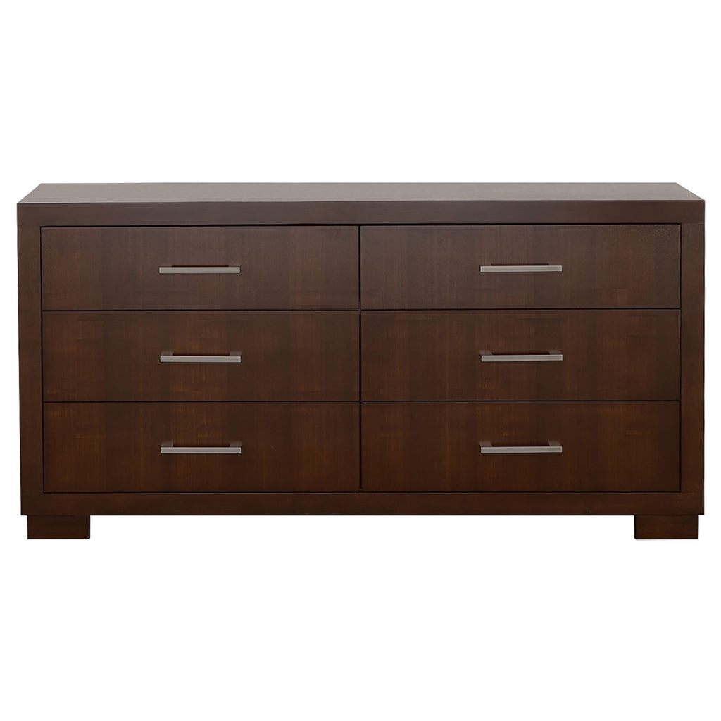 Grounded and simple, this six drawer dresser brings a calm rhythm to the room. The cappuccino finish feels rich without shouting, while long bar pulls add a subtle shine and the broad top gives space for a favorite mirror, a plant, or framed photos.