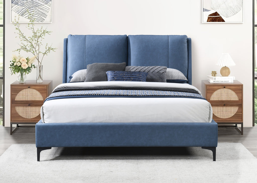 Transform your bedroom with this stunning blue upholstered platform bed, featuring a luxurious large pillowed headboard for ultimate comfort and support. Expertly crafted in Malaysia, its sleek design and clean lines create a modern and inviting aesthetic for any space. Upholstered in durable 100% polyester fabric, this fully upholstered bed offers long-lasting style and easy maintenance.