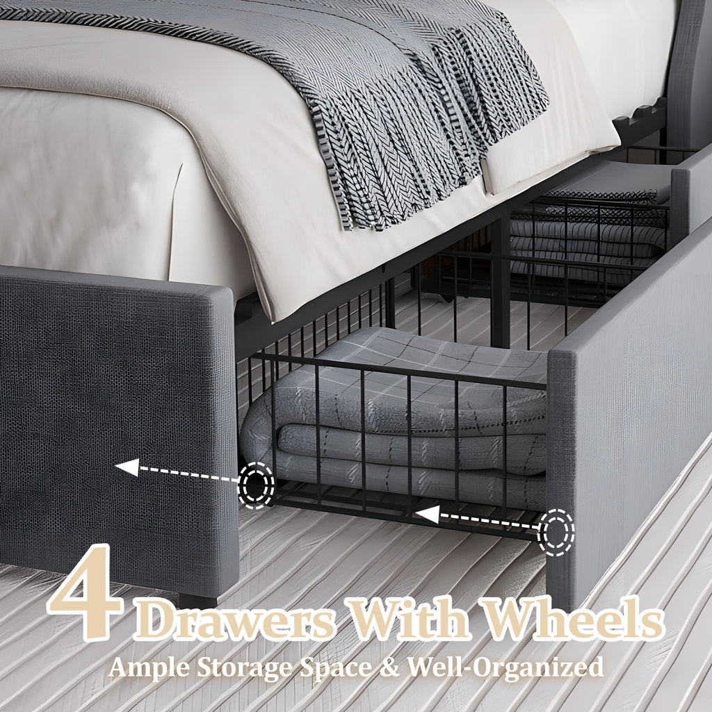 - UPHOLSTERED BED WITH DRAWER: Four invisible under-bed storage drawers with wheels, still maintain a fashionable appearance, no more worry about crowded closets