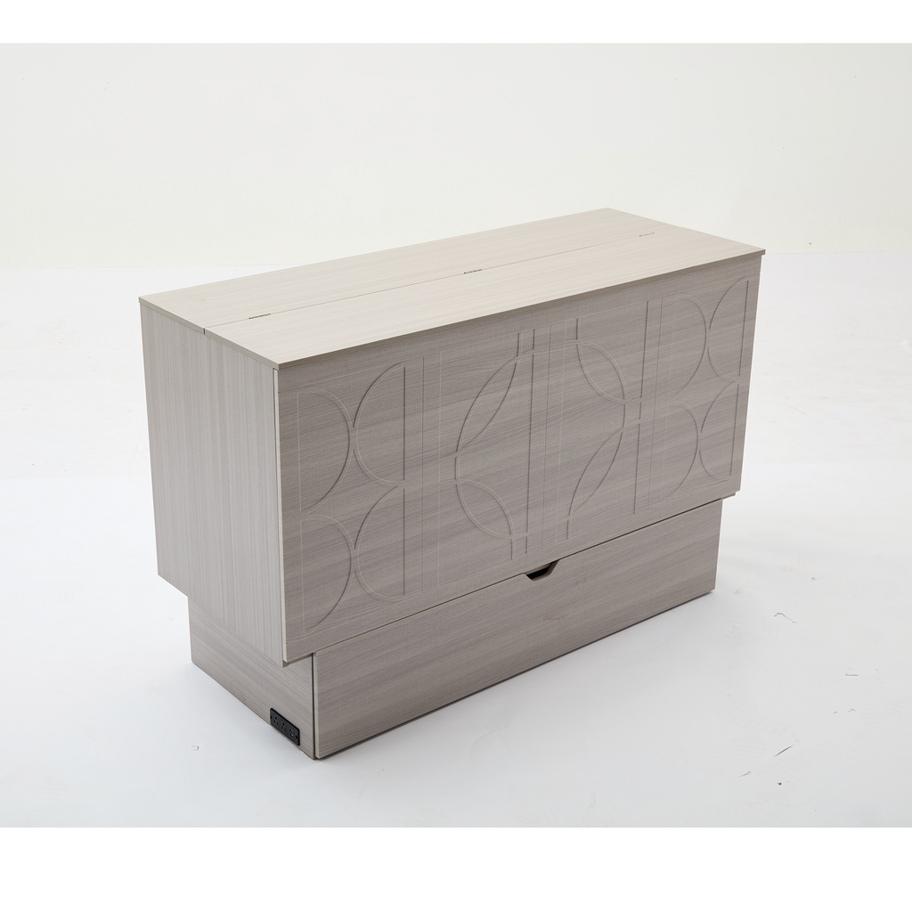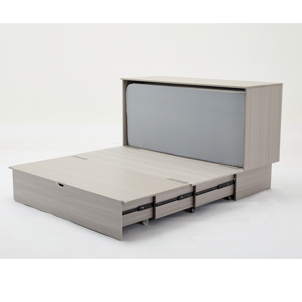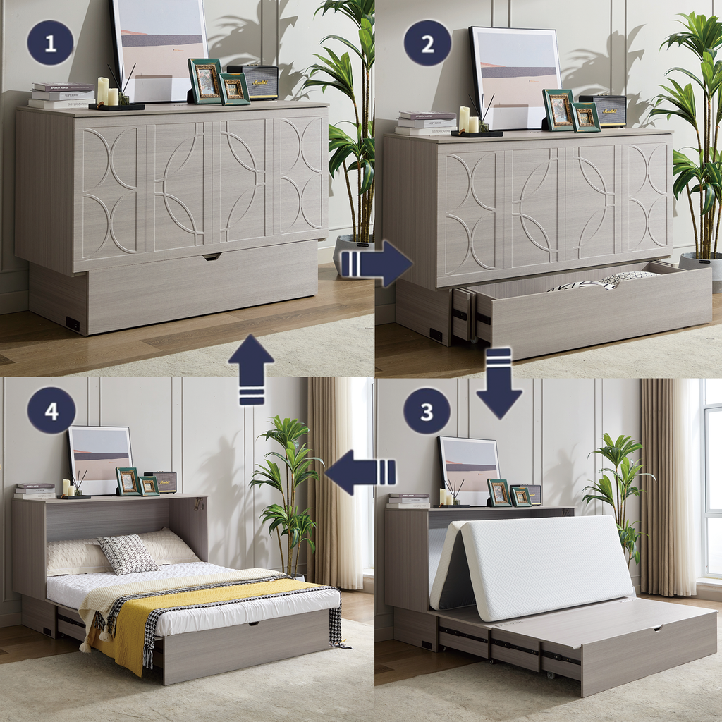 Our murphy bed is housed in a beautiful cabinet, it can be easily opened as a bed for you or overnight guests or put away as a cabinet in the living room in daily life.   Which is easily converted between the bed and cabinet with the help of slides and pulleys.