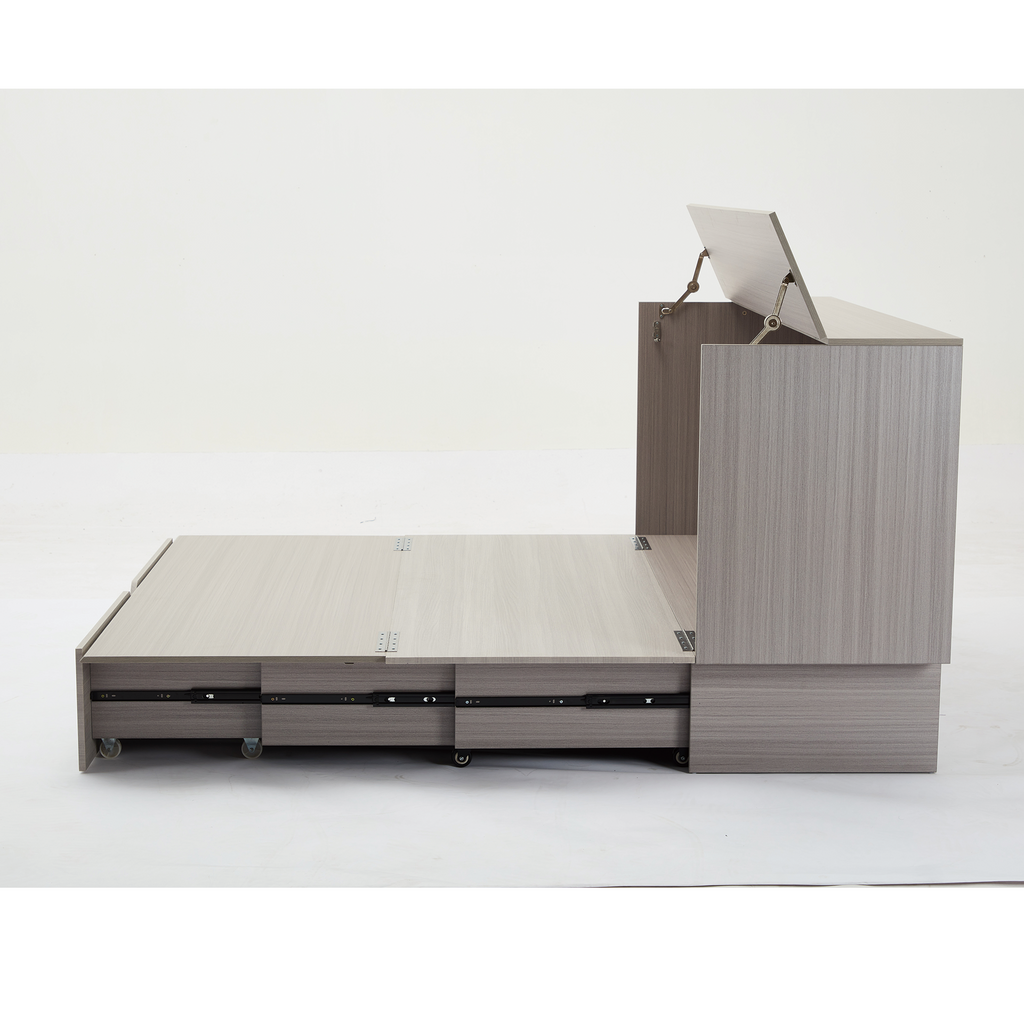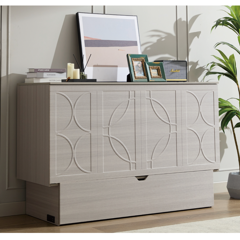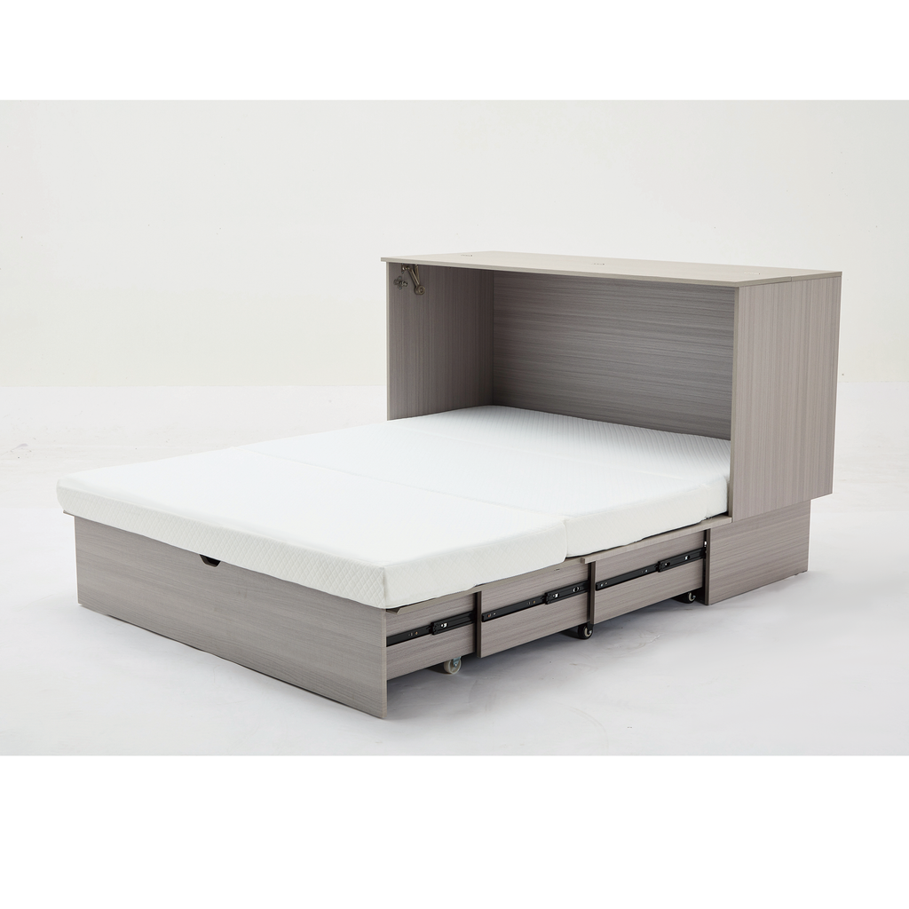 Our murphy bed is housed in a beautiful cabinet, it can be easily opened as a bed for you or overnight guests or put away as a cabinet in the living room in daily life.   Which is easily converted between the bed and cabinet with the help of slides and pulleys.