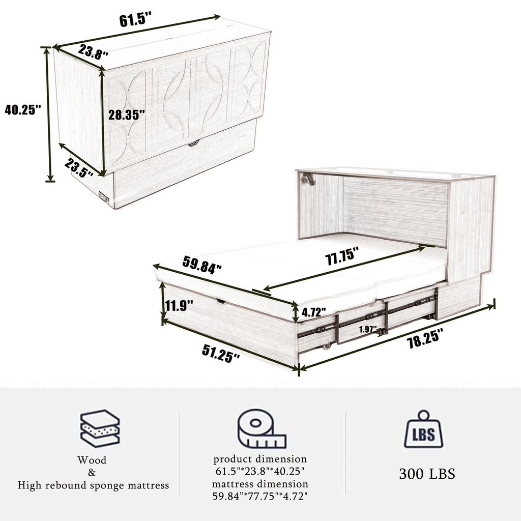 - 【Stylish & Dimensioned】: Cabinet size: 61.5'W * 23.8'D * 40.25'H; Mattress: 59.84'W * 77.75'D * 4.72'H; Bed: 61.5'W * 78.25'D * 40.25'H. It can support up to 300 pounds!