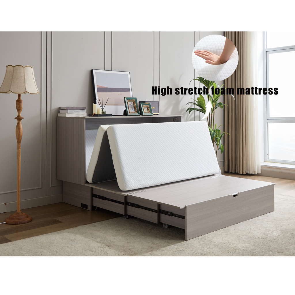 - 【Superior Build】: Crafted with composite wood comprising, Reliable woodand wheels ensure an easy transformation from cabinet to bed. Complemented by a high-resilience compressed mattress for a comfortable sleep.
