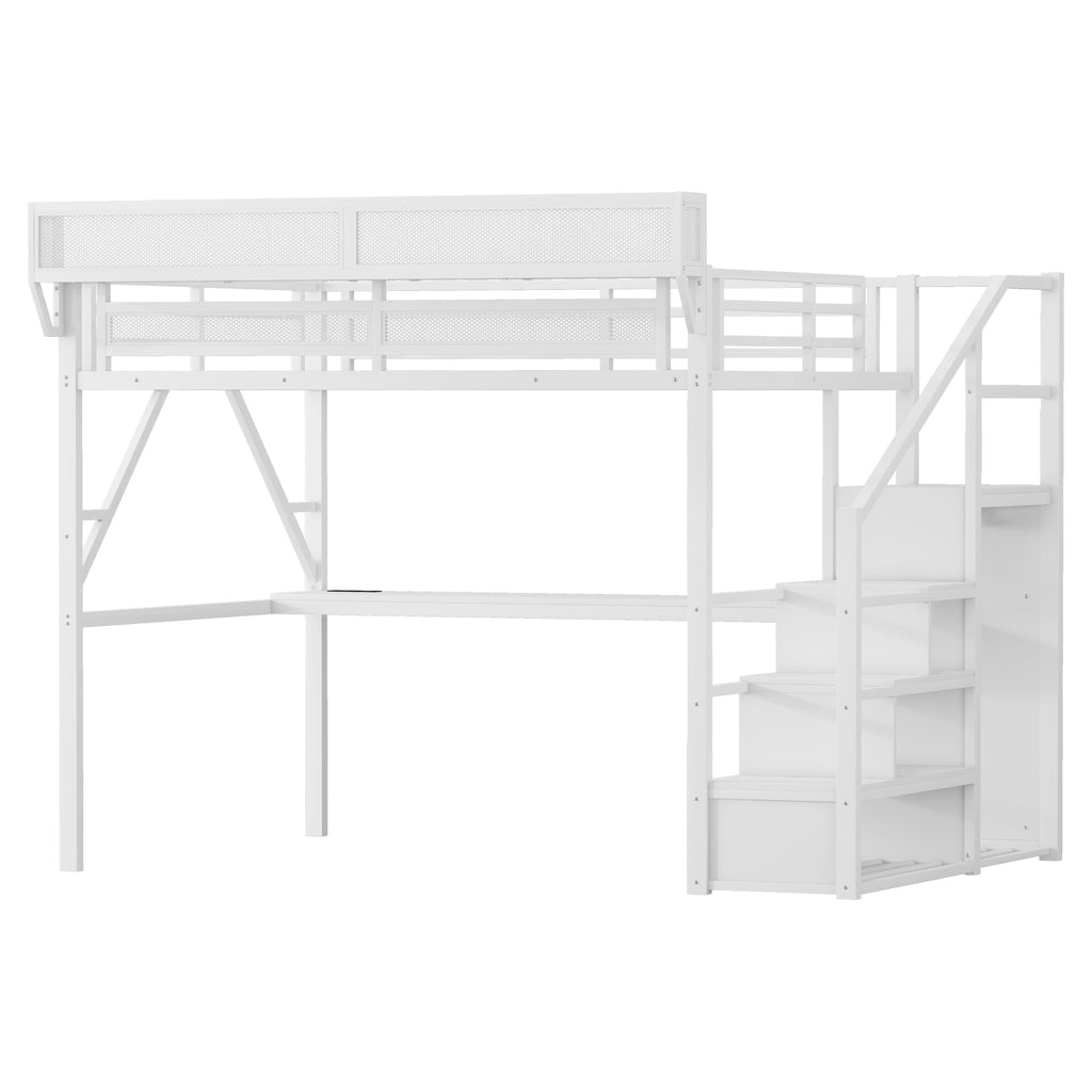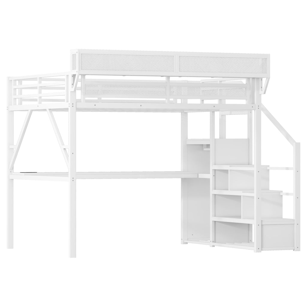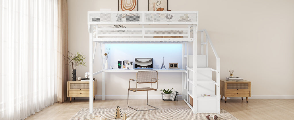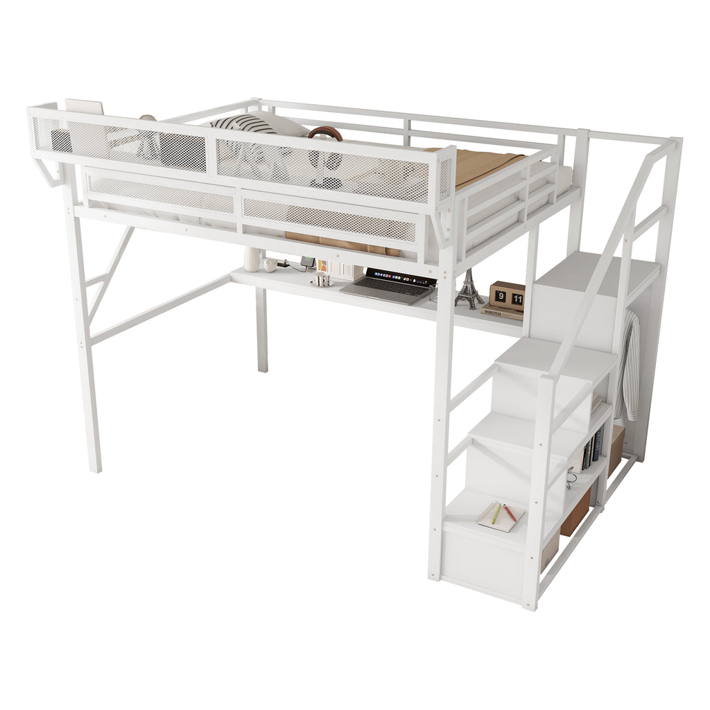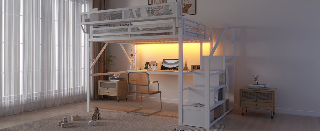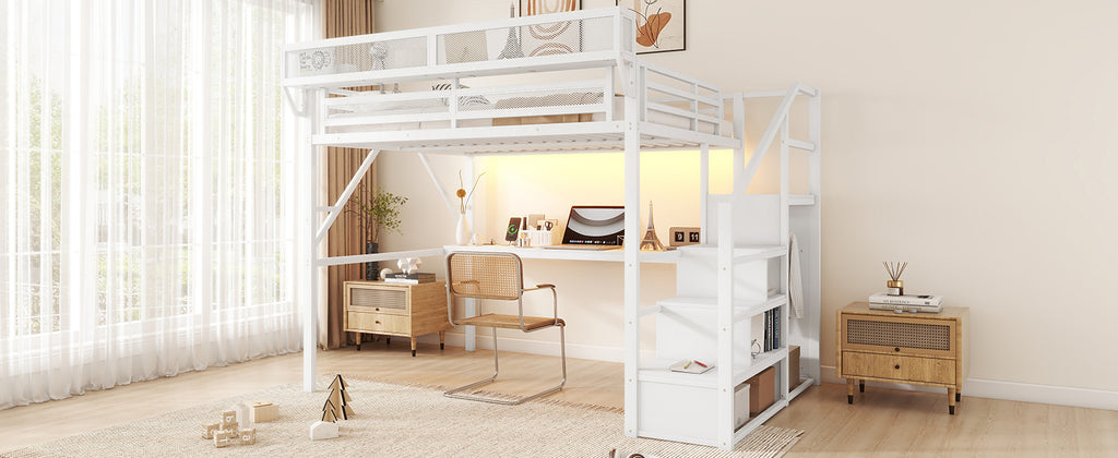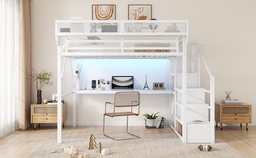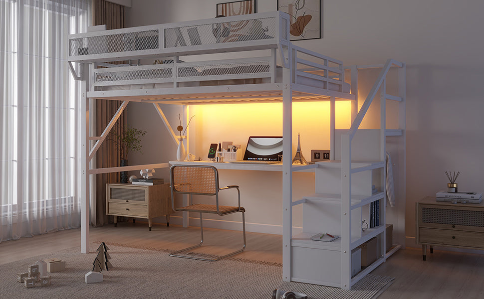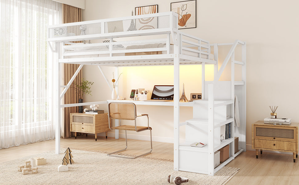 Queen Loft Bed with Desk and Charging Station, Queen Size Metal Loft Bed with Stairs and Light