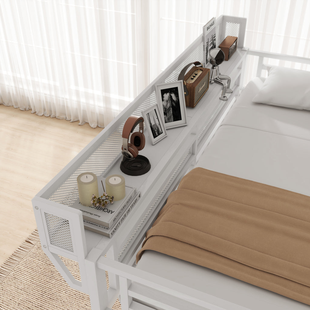 - 【Queen Loft Bed with Storage Shelves for Upper】The queen metal loft bed features a storage shelf next to the upper bed, providing extra storage space. This shelf is perfect for keeping books, gadgets, or small items within easy reach. The shelf have mesh around which prevent the thing fall down. It adds functionality without compromising space.
