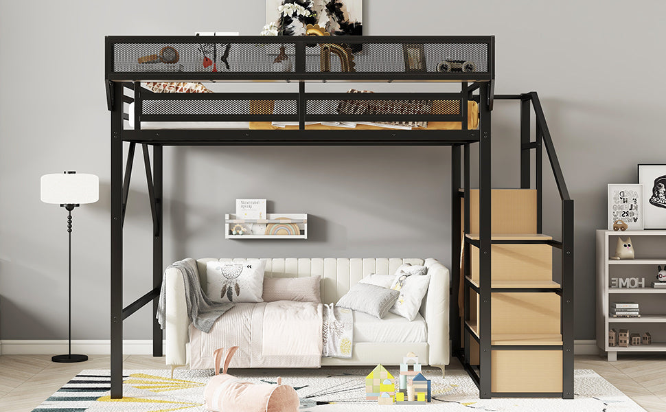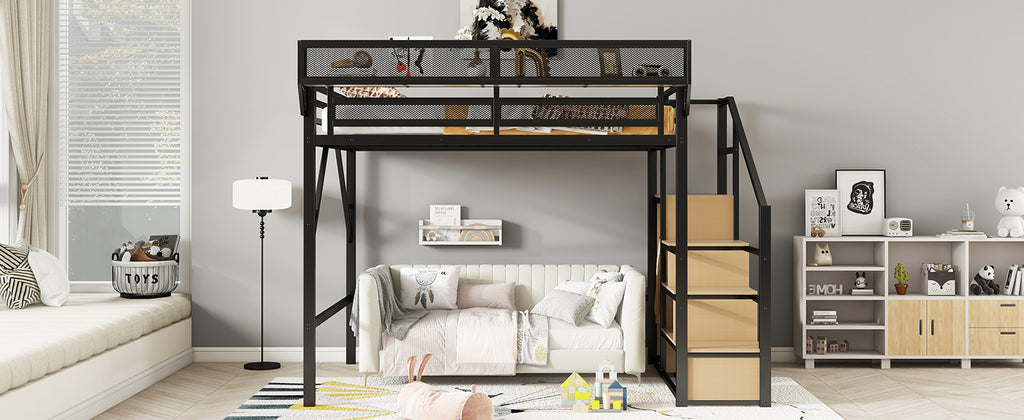 - Metal queen Loft Bed with Staircase】The metal queen size loft bed come with staircase includes built-in storage compartments, making it easy to store items like shoes, toys, or blankets. The steps ensure safe and convenient access to the upper bed, enhancing both practicality and safety. The stairs can be installed on either right side or left side.