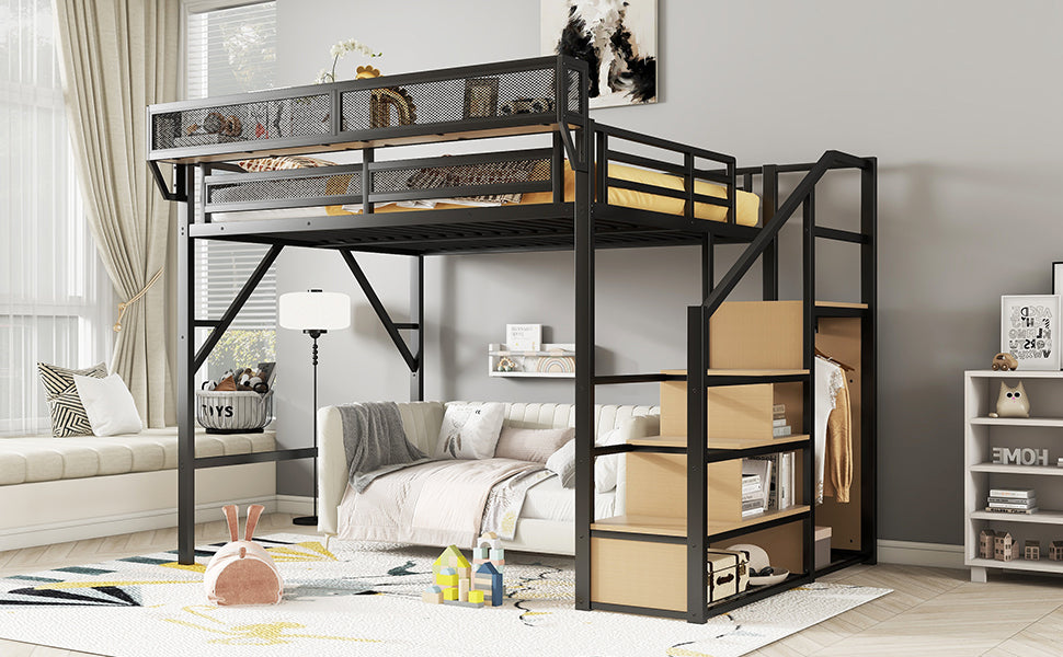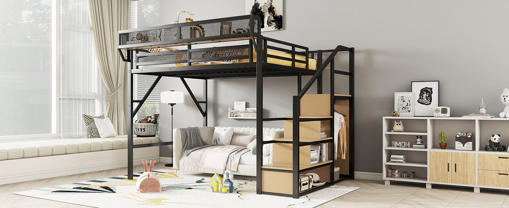 Queen Size Loft Bed with Stairs, Metal Queen Loft Bed with Storage Shelves