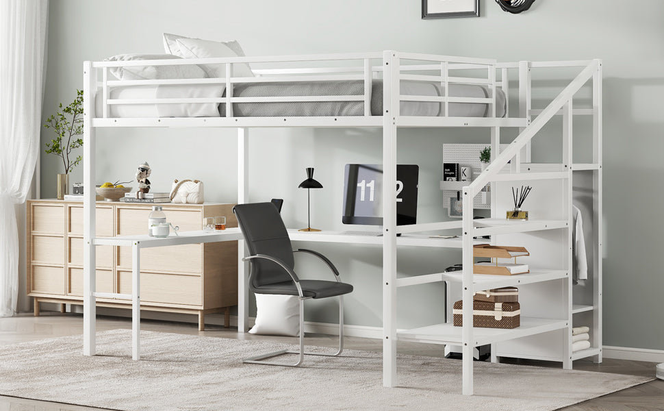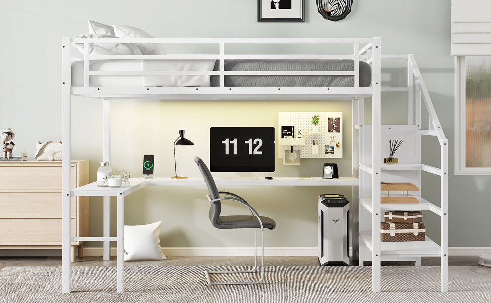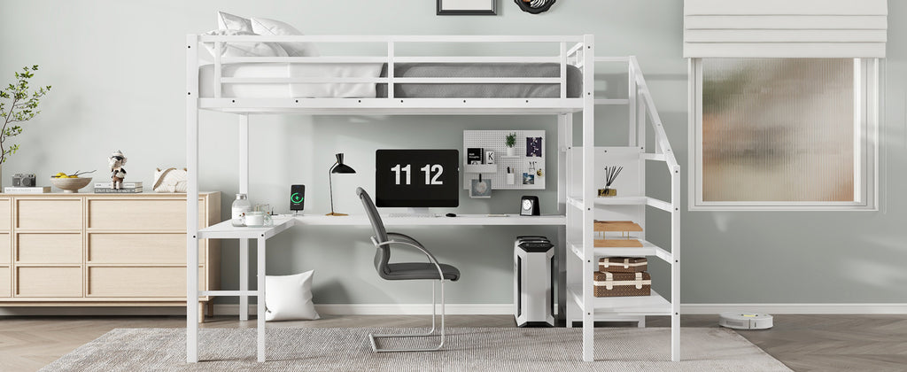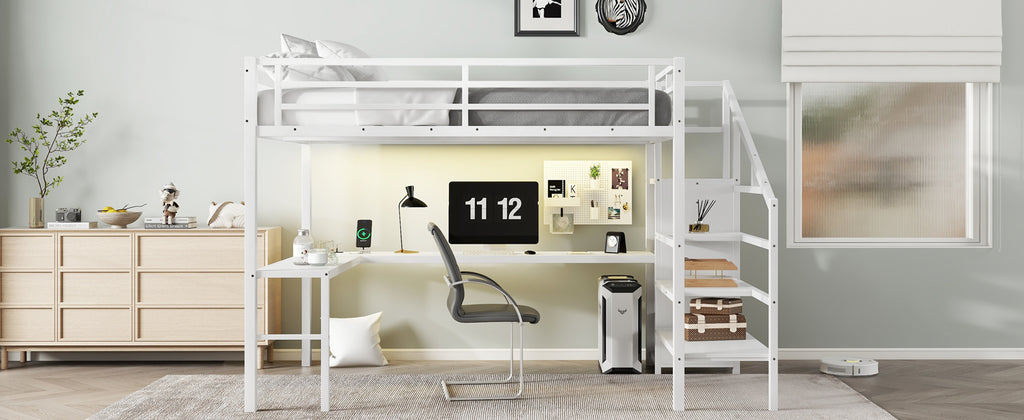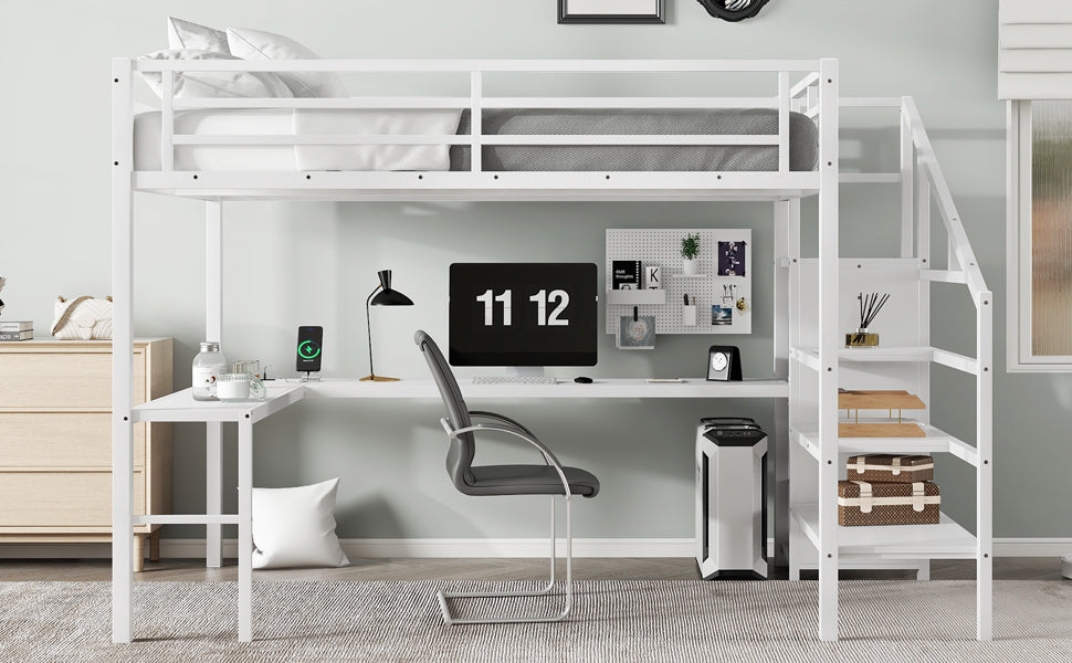 - Space-Saving Loft Bed & Workspace - This metal loft bed has a cozy sleeping space, and a spacious and practical L-shaped desk underneath that can be used as a workbench, reading area, etc. where you can create your own little world. The space-saving design adds a touch of elegance to any bedroom.