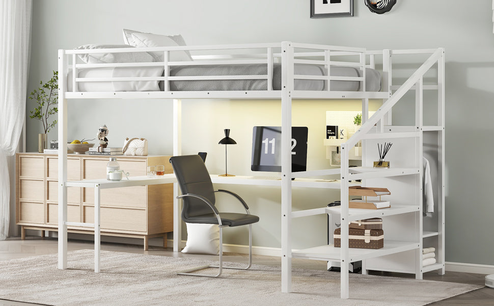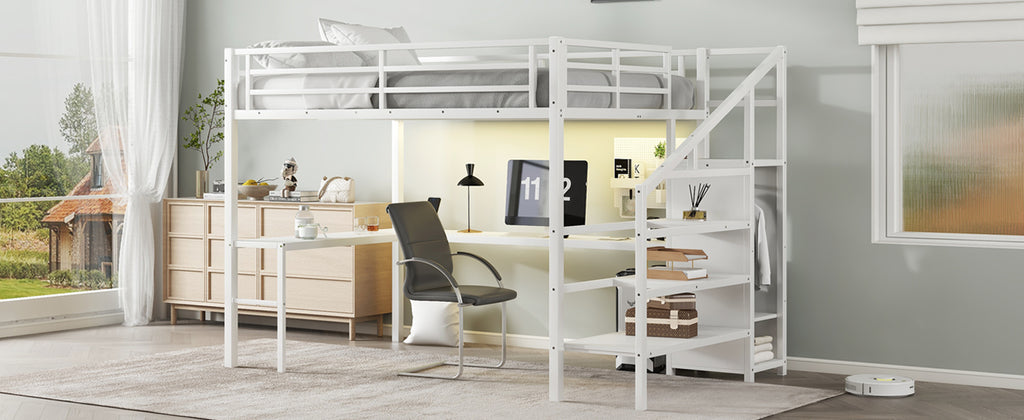 - Loft Bed with USB and LED - The queen size bed's desk comes with a USB charging station for charging electronics that is convenience to your daily life.The LED light strip adds a sense of ambiance to your room while making it easy for you to wake up at night.