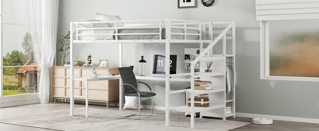 - Queen Size Loft Bed with Wardrobe and Stairs - The loft bed has a wardrobe that comes with its own hanging rod and an adjustable divider at the bottom, which can be used to store quilts, storage boxes or shoes. The versatile built-in staircase can also be used as storage space and can be fitted left or right as required.