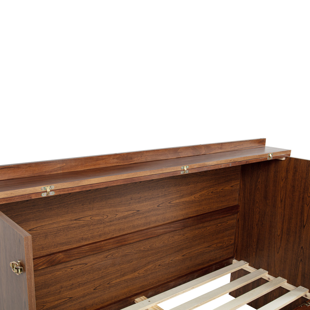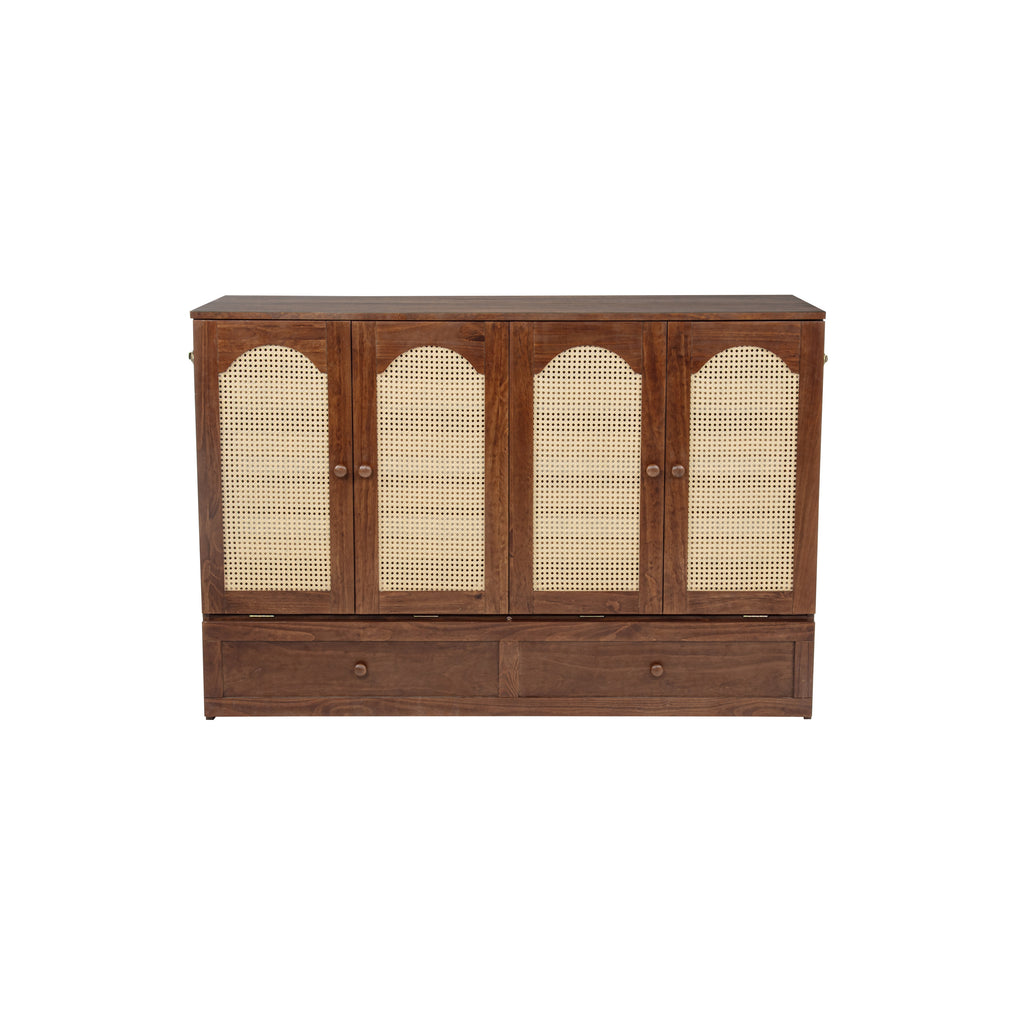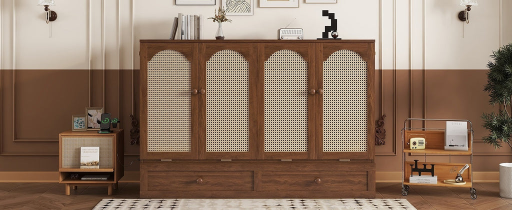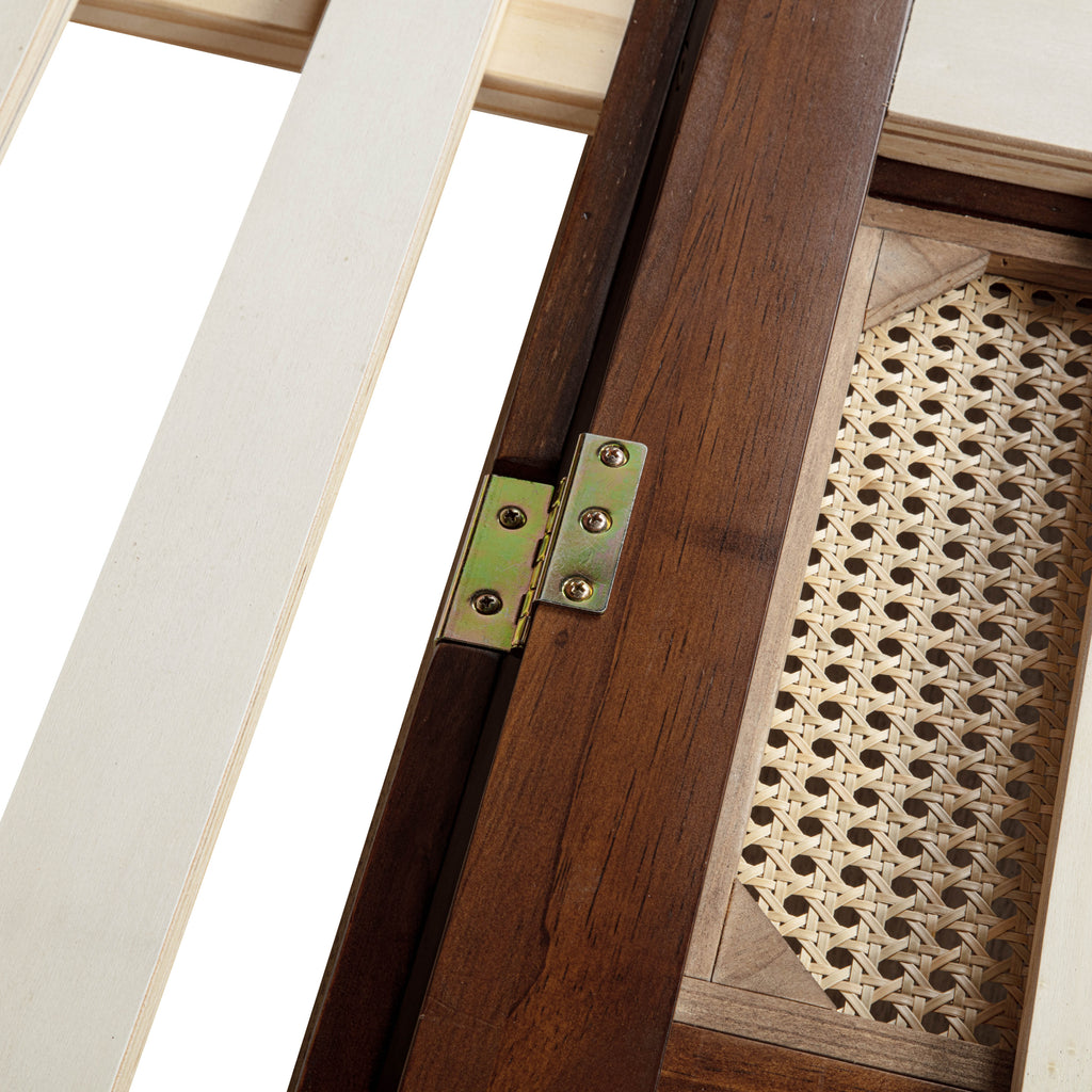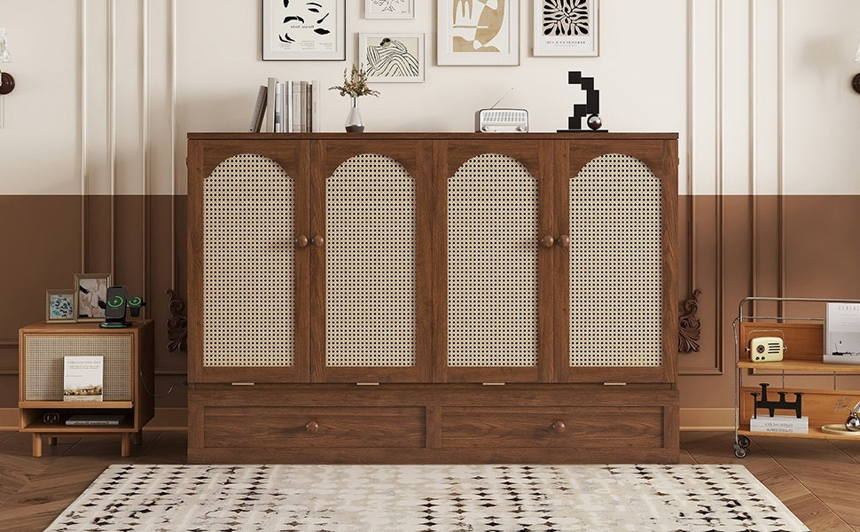 This versatile cabinet bed ingeniously can be used conveniently as a multi-functional cabinet and a bed as well. It’s effortlessly transformed into a comfortable sleeping space by nightfall, perfectly suited for accommodating overnight guests and fostering family gatherings, The distinctive rattan decoration panel of this cabinet bed harmoniously infuse your bedroom décor with a vintage attraction and fostering a cozy yet fashionable ambiance. Moreover, the bed is an example of superior craftsmanship and long-lasting materials further elevating its overall aesthetic appeal
