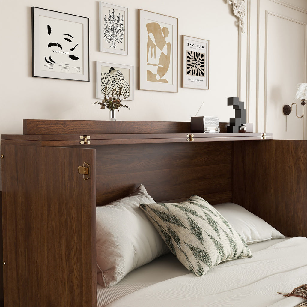 - [Straightforward Assembly] Coming in two packages, this bed cabinet includes comprehensive assembly instructions and all necessary hardware for a hassle-free setup. It requires assembly by following the manual instruction steps. Our cabinet bed is equipped with a sturdy support system, allowing you to place your mattress (mattress not included, 3-folded mattress with a thickness less than 5 inches suggested) directly on it.