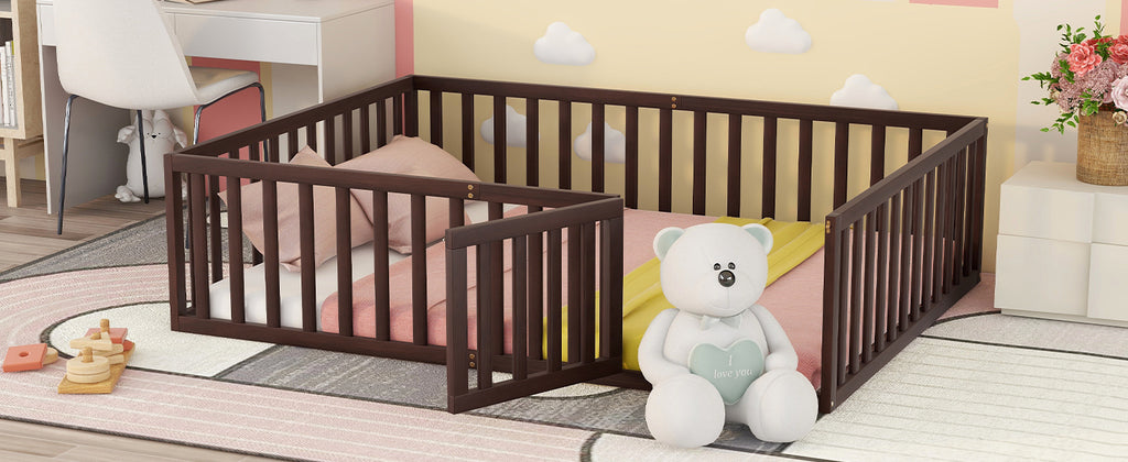 Transform your child's room with our Queen Size Solid Wood Floor Bed, featuring a unique fence and charming functional door for ultimate versatility and safety. Crafted from durable pine wood in a rich walnut finish, this innovative floor bed offers a secure sleeping space or imaginative play area, inspiring endless fun. Its elegant, low-profile design seamlessly integrates into any decor, providing a stylish and engaging foundation for your child's dreams.