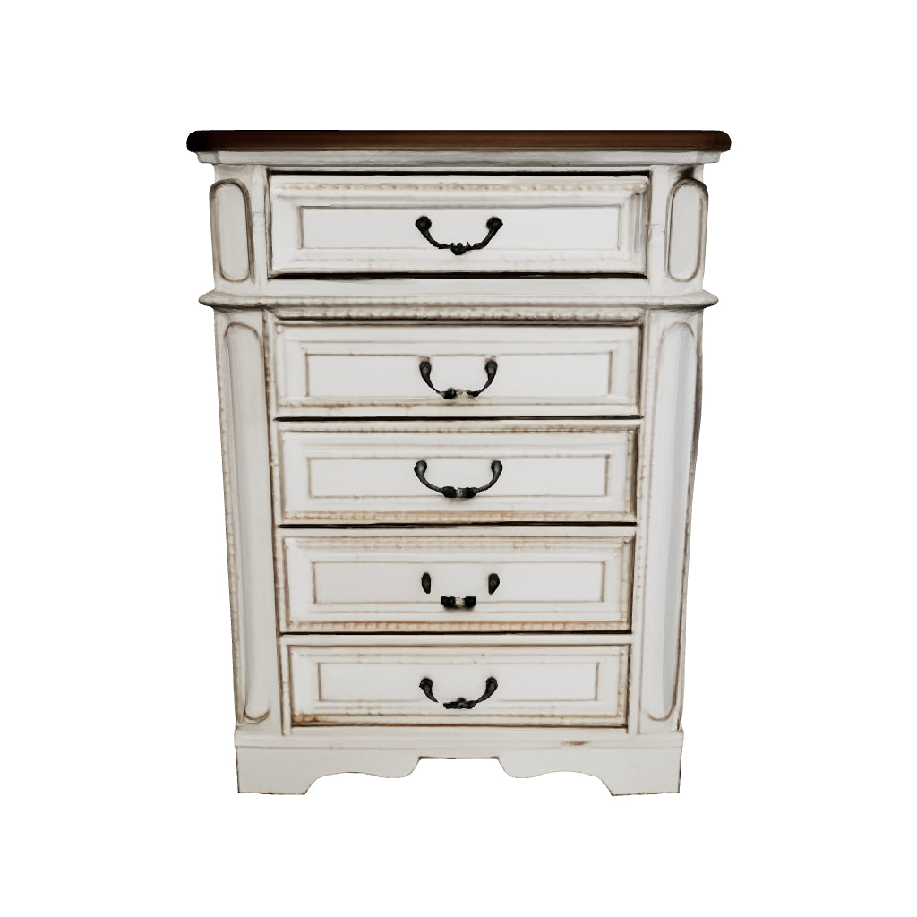 Elevating the art of traditional cottage styling, this chest of drawers is your dream bedroom retreat realized. Antiqued two-tone aesthetic blends a chipped white with a distressed wood finished top for added charm. Framed drawer fronts and decorative corbels add refinement, while bail pulls in a dark bronze-tone finish lend a classic touch.