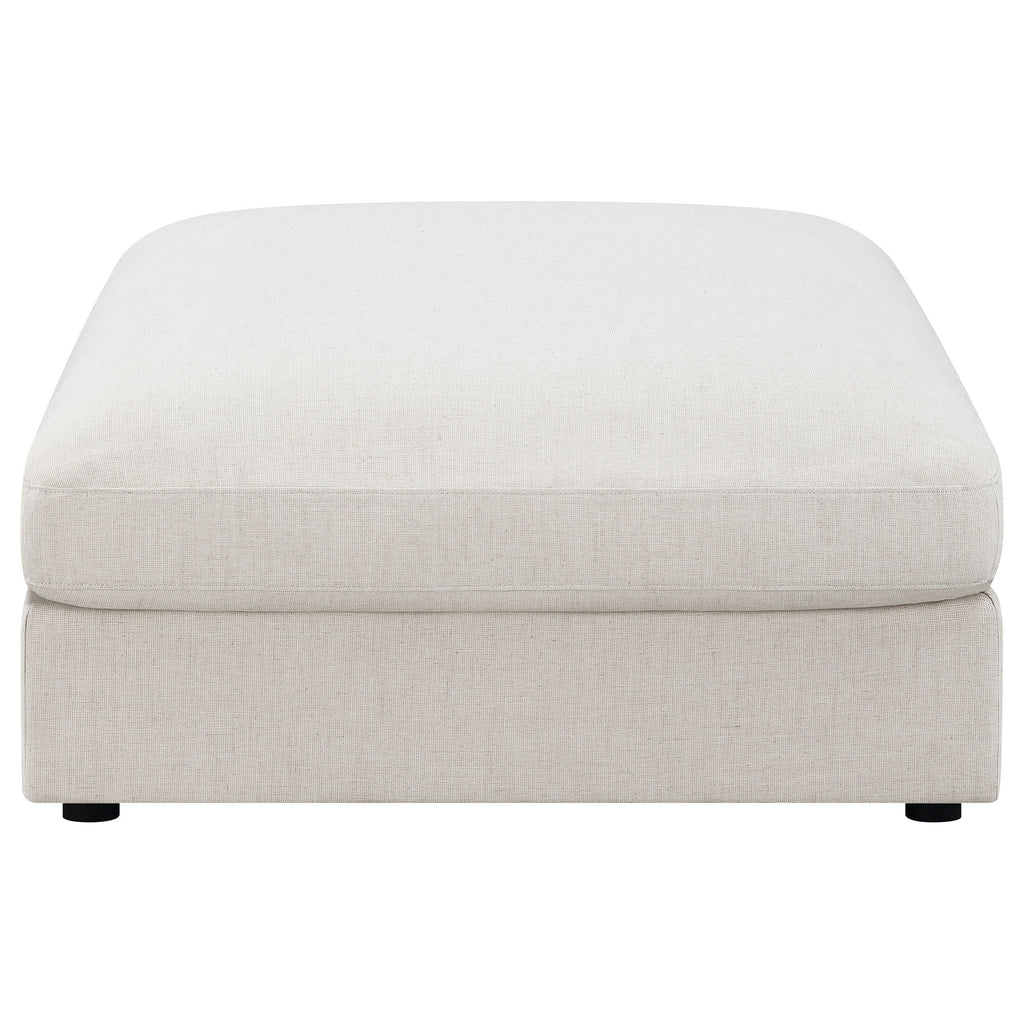 An ottoman adds the perfect bit of extended space to this modular, contemporary sectional sofa. Plush feather blend cushions ensure optimal lounging while linen upholstery and jacquard accent pillows bring a refined finishing touch.