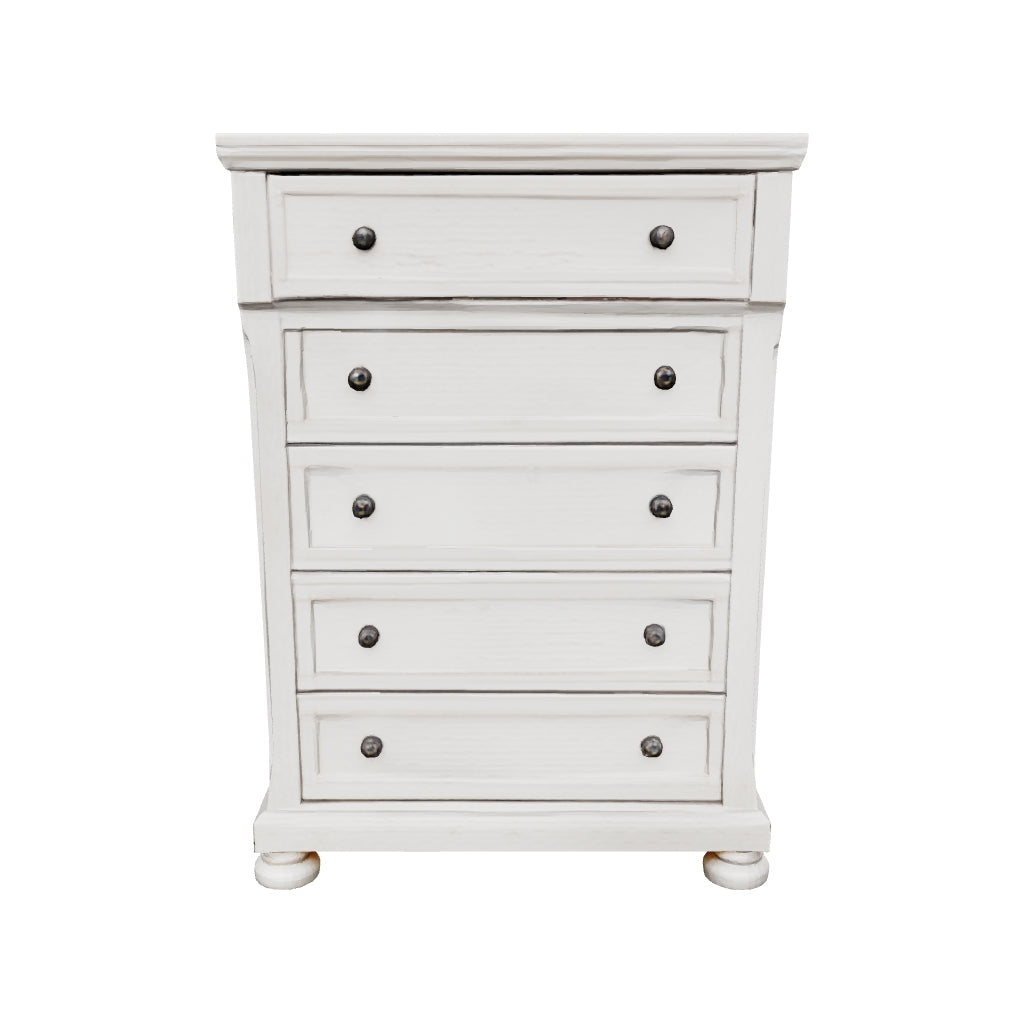 Elegant, timeless furnishings take your bedroom to the next level. Nothing does that better than this chest. The antiqued white finish with a wonderful grain texture radiates sophistication, while the dark bronze-tone hardware adds an ornate touch. A felt-lined top drawer rounds out the piece for the ultimate tasteful bedroom.